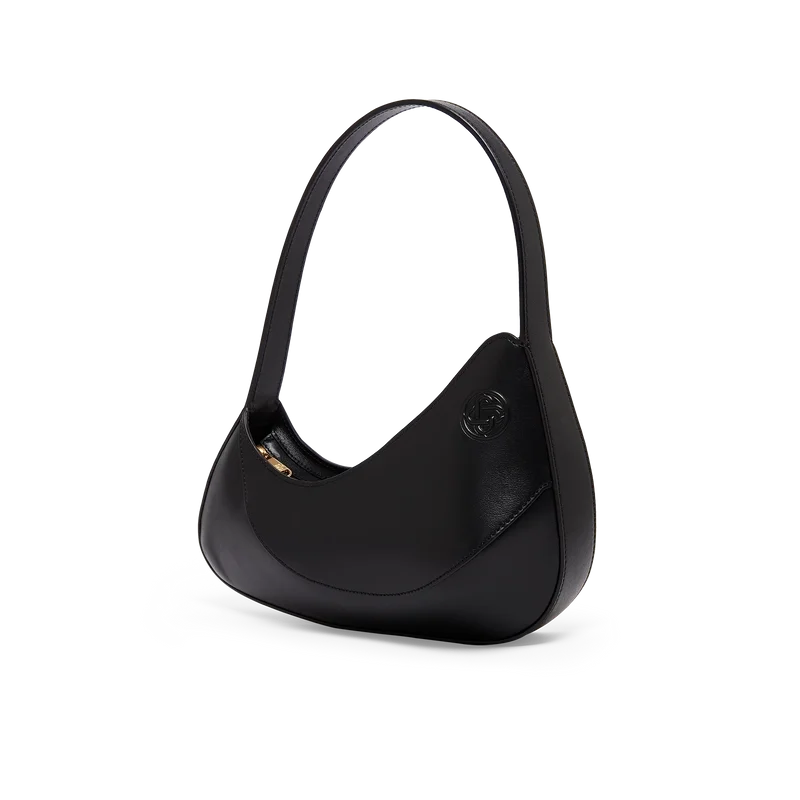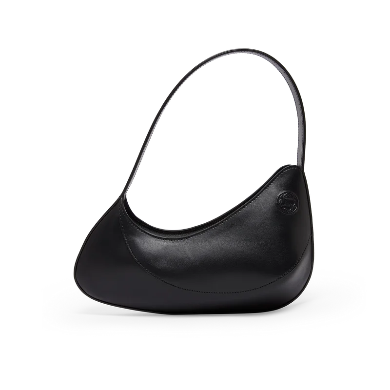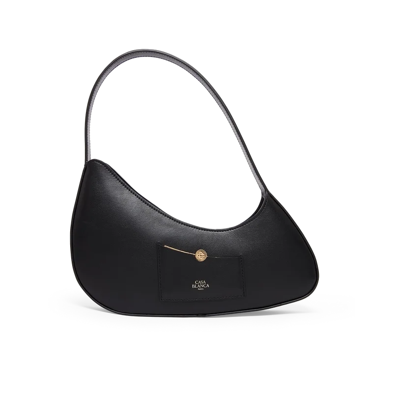 Die schwarze Raver-Tasche ist eine am Körper getragene Abendtasche aus Ziegen- und Kalbsleder mit dem runden Casablanca-Logo-Patch des Hauses. Ausgestattet mit einem Schulterriemen, Reißverschluss und einer inneren Einstecktasche.