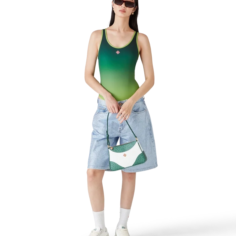 Der Gradient-Badeanzug ist ein bedrucktes Design aus atmungsaktivem, technischem Badestoff mit einem grünen Farbverlauf. Abgerundet wird er durch kontrastfarbene Paspeln, hoch geschnittene Beine, einen U-Ausschnitt, einen Ausschnitt am Rücken und das charakteristische Rautenlogo des Hauses auf der Brust.