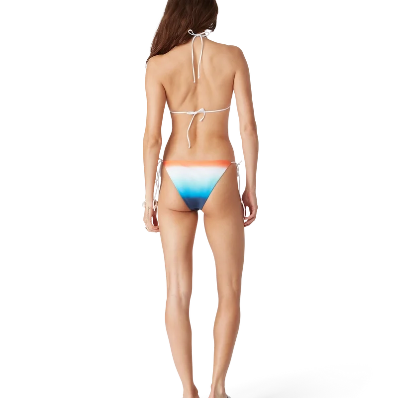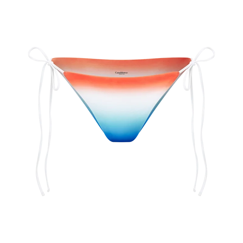 Der Gradient Bikini-Slip ist ein bedrucktes Design aus atmungsaktivem Funktionsstoff, das sich durch eine zurückhaltende Farbpalette aus Blau, Aqua, Weiß und Orange in einem speziell für die Kollektion entworfenen Farbverlauf auszeichnet. Abgerundet wird das Design durch weiße Paspeln und einen String-Verschluss sowie die für das Haus charakteristische, ineinander verschlungene CC-Niete – gedacht zum Tragen mit dem passenden Oberteil.