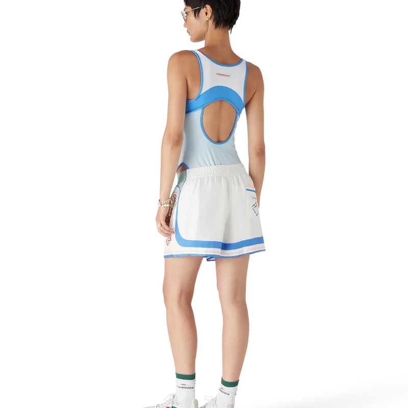 Der Fuji Dream Badeanzug ist ein bedrucktes Design mit Airbrush-Motiven – einem neuen Medium, das in dieser Kollektion durchgehend zum Einsatz kommt – gefertigt aus einem atmungsaktiven technischen Badestoff. Abgerundet durch hoch geschnittene Beine, einen U-Ausschnitt, einen Cut-Out am Rücken und das saisonale Motiv des Hauses auf der Brust.