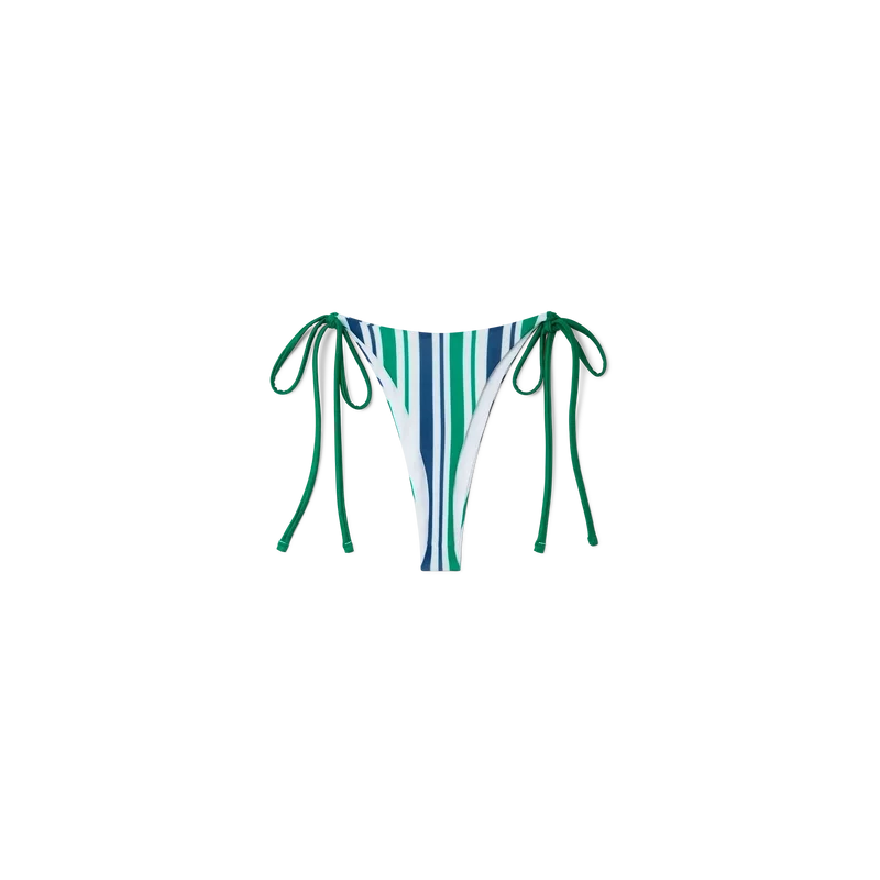 Das gestreifte String-Bikinihöschen in saisonalen Farben mit weißem Stringverschluss an der Hüfte. Dieses Modell ist mit grünen Verzierungen versehen und dazu gedacht, mit dem passenden Oberteil getragen zu werden.