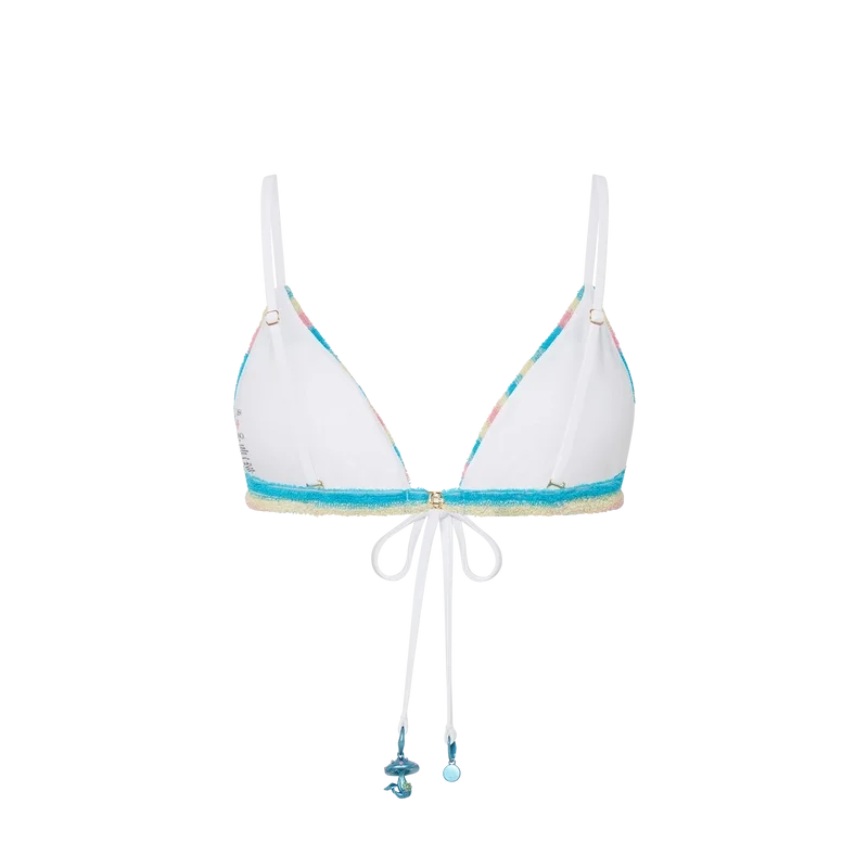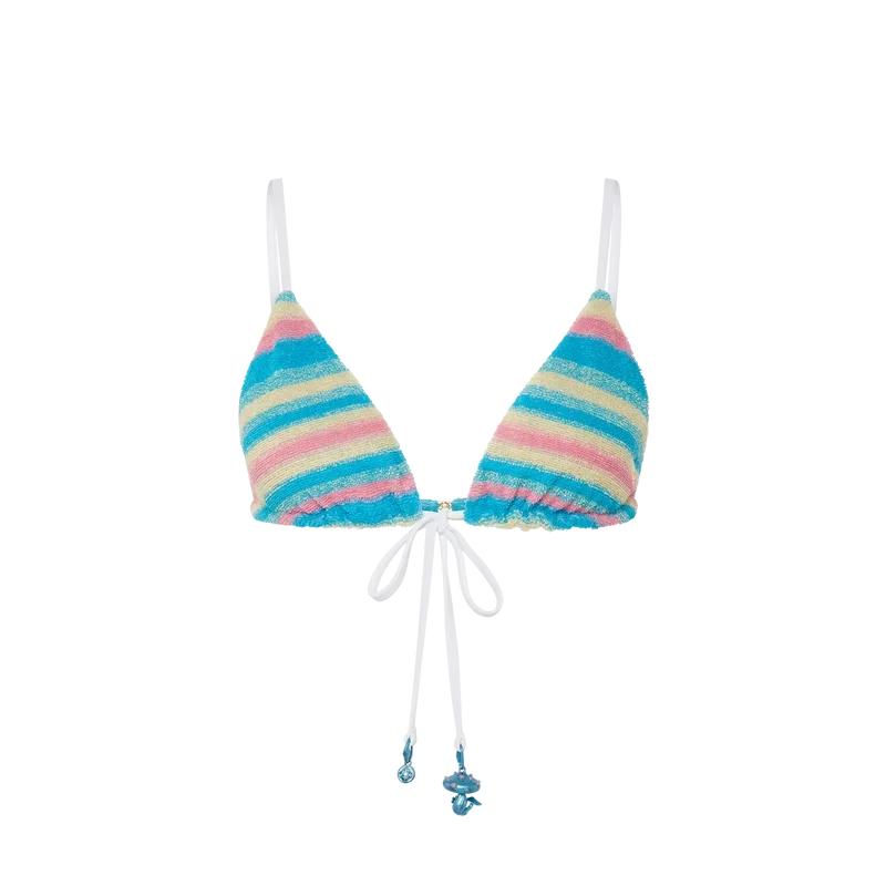 Das gestreifte Bikini-Oberteil aus Frottee ist aus Frottee-Stoff gefertigt und mit dem vergoldeten, ineinander verschlungenen CC-Nieten-Logo des Hauses verziert. Abgerundet wird es durch einen kontrastierenden Kordelzugverschluss am Hals und am Rücken sowie durch die saisonalen Pilz- und CC-Logo-Anhänger des Hauses.