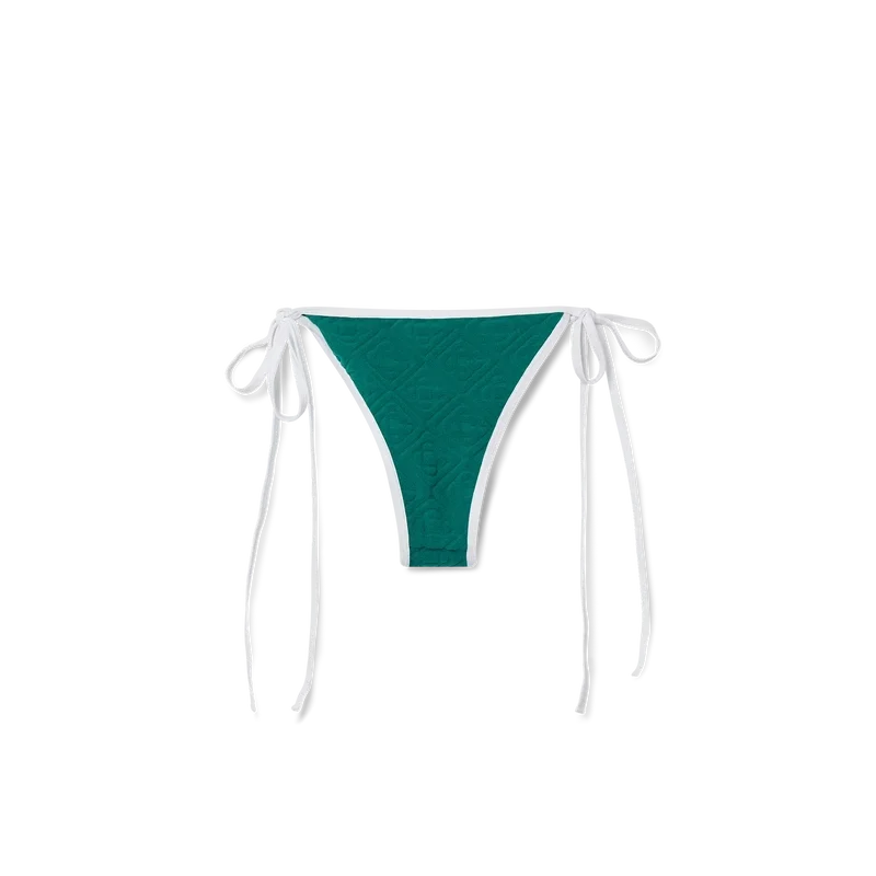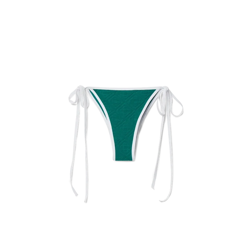 Das grüne Monogram-Bikini-Höschen wird an der Hüfte mit weißen Kontrastbändern gebunden. Es ist aus Monogram 3D-Jersey gefertigt, verfügt über weiße Paspeln und ist dazu gedacht, mit dem passenden Bikini-Oberteil getragen zu werden.