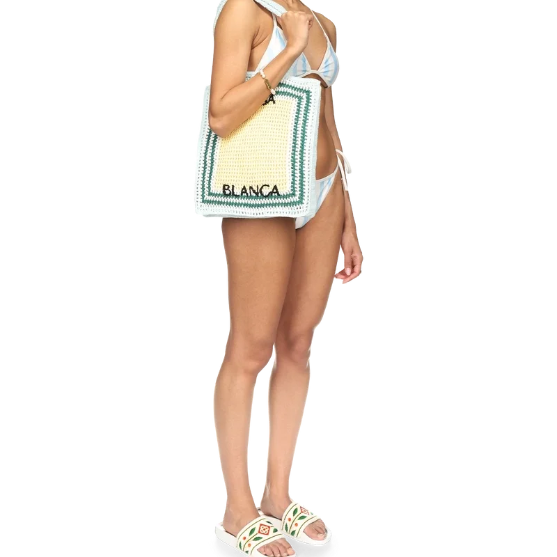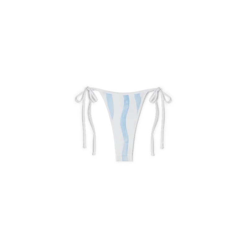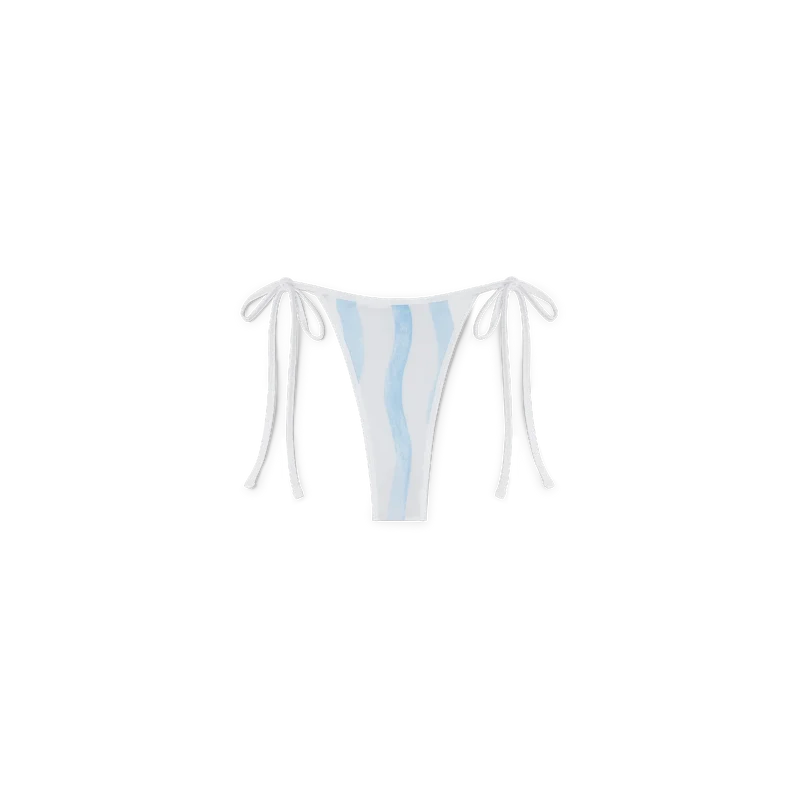 Das Wave Bikini-Höschen hat ein blau-weißes Wellenstreifen-Design und wird an der Hüfte mit weißen Bändern gebunden. Es ist aus einem Polyester-Mischgewebe gefertigt, verfügt über weiße Verzierungen und ist dazu gedacht, mit dem passenden Bikini-Oberteil getragen zu werden.