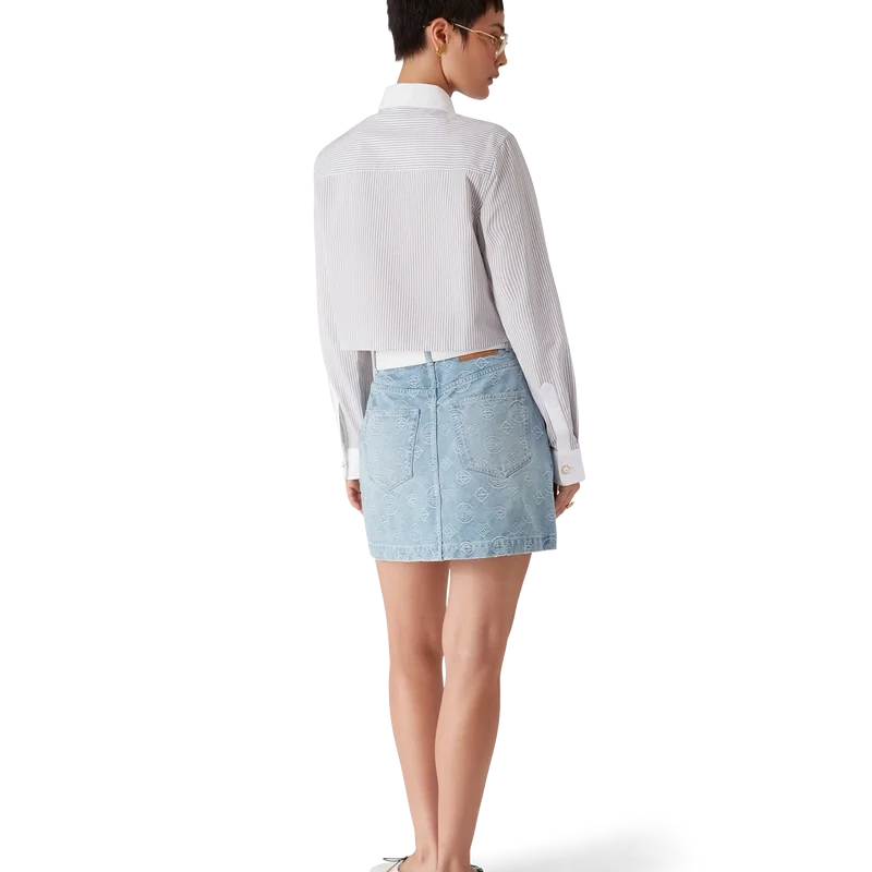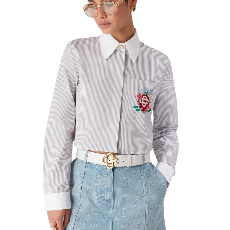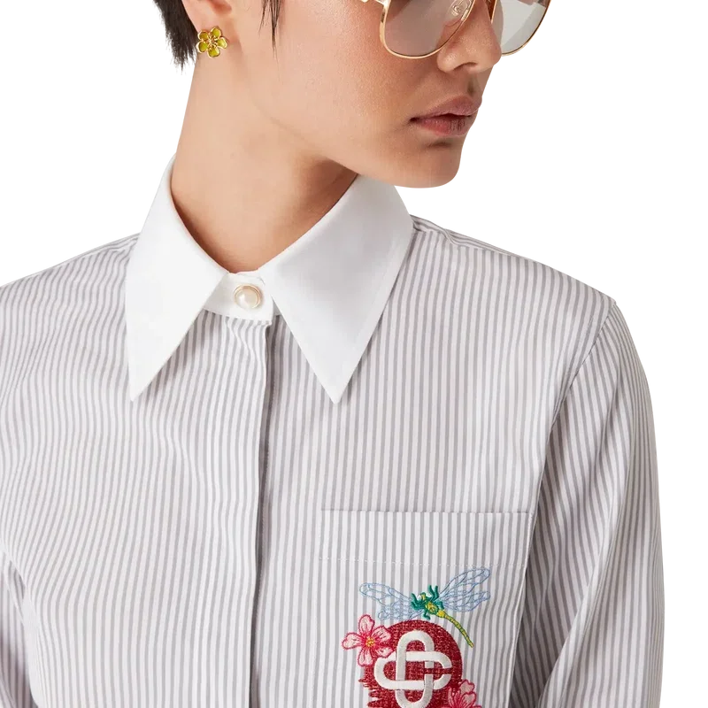 Das gestreifte, verkürzte Langarmhemd ist ein kurz geschnittenes Modell aus Baumwoll-Barra-Stoff. Mit Knopfleiste, ineinander verschlungenen Cc-Logo-Knöpfen aus Corozo, charakteristischen goldumrandeten Perlenknöpfen an Kragen und Manschetten, einer Brusttasche mit dem saisonalen Libellen-Blumenmotiv sowie kontrastierendem weißem Spitzkragen und Manschetten.