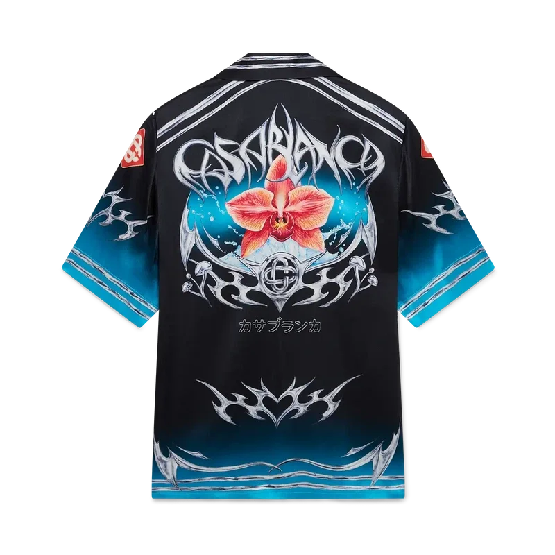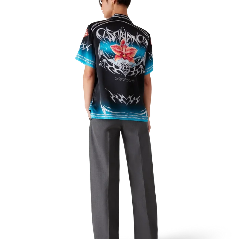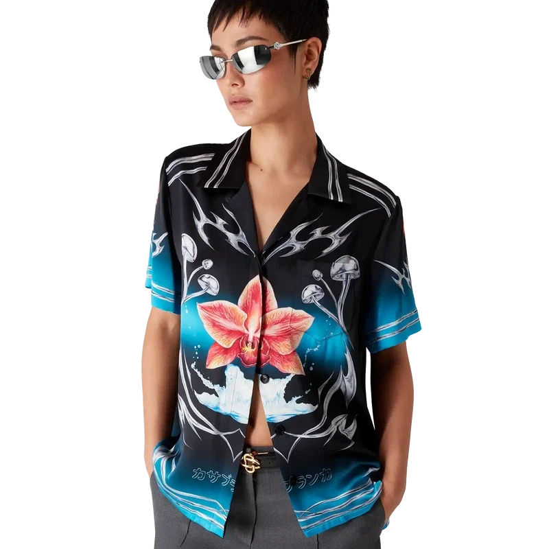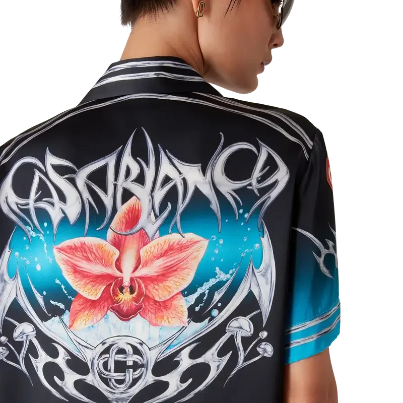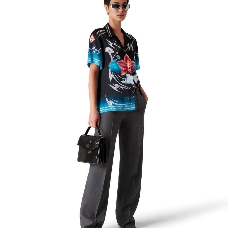 Das Blades-Kurzarmhemd aus Seidensatin ist ein bedrucktes Design mit einem Motiv, das mit dem Kontrast zwischen zwei gegensätzlichen Empfindungen spielt – der Schärfe der Klinge und dem kalten, silbernen Chrom, kontrastiert mit der Wärme der Natur, wie den kräftigen Rosa- und Rottönen einer Orchideenblüte. Das Hinzufügen von Wasser verleiht dem Design eine frische, klare Note. Abgerundet wird das Hemd durch einen Kubanerkragen, eine Brusttasche, einen Knopfverschluss und die charakteristischen, ineinander verschlungenen Cc-Corozo-Knöpfe.