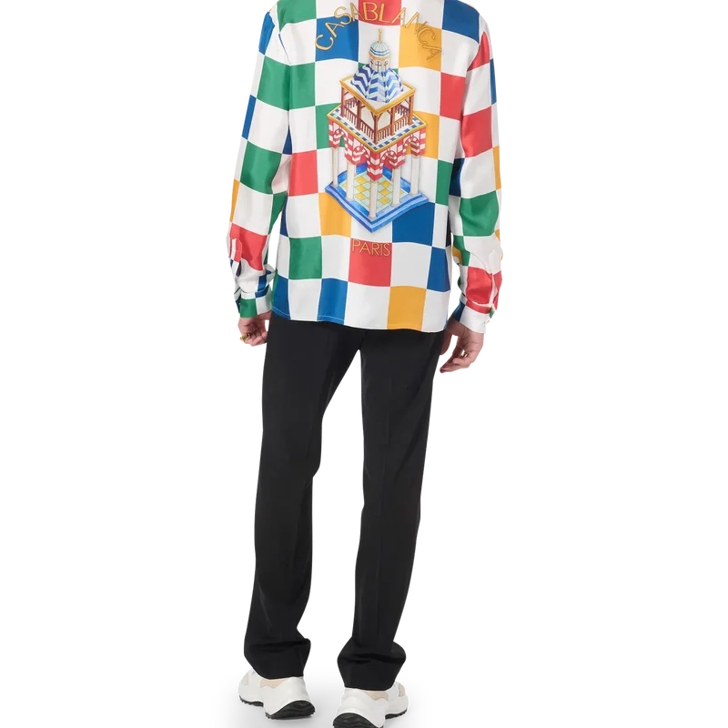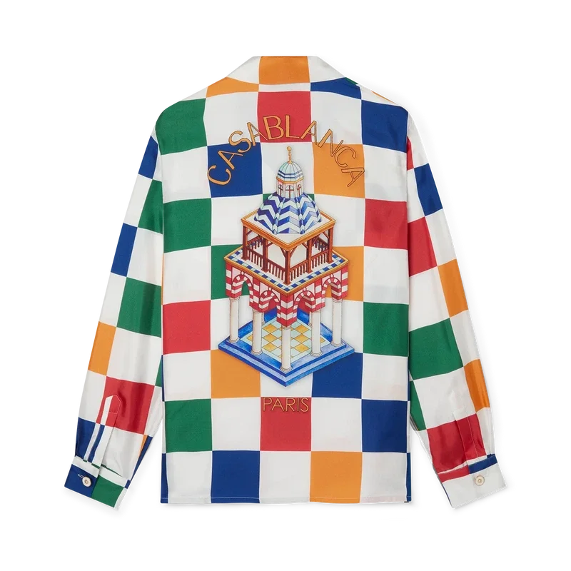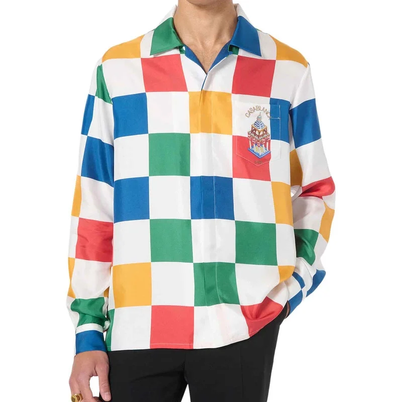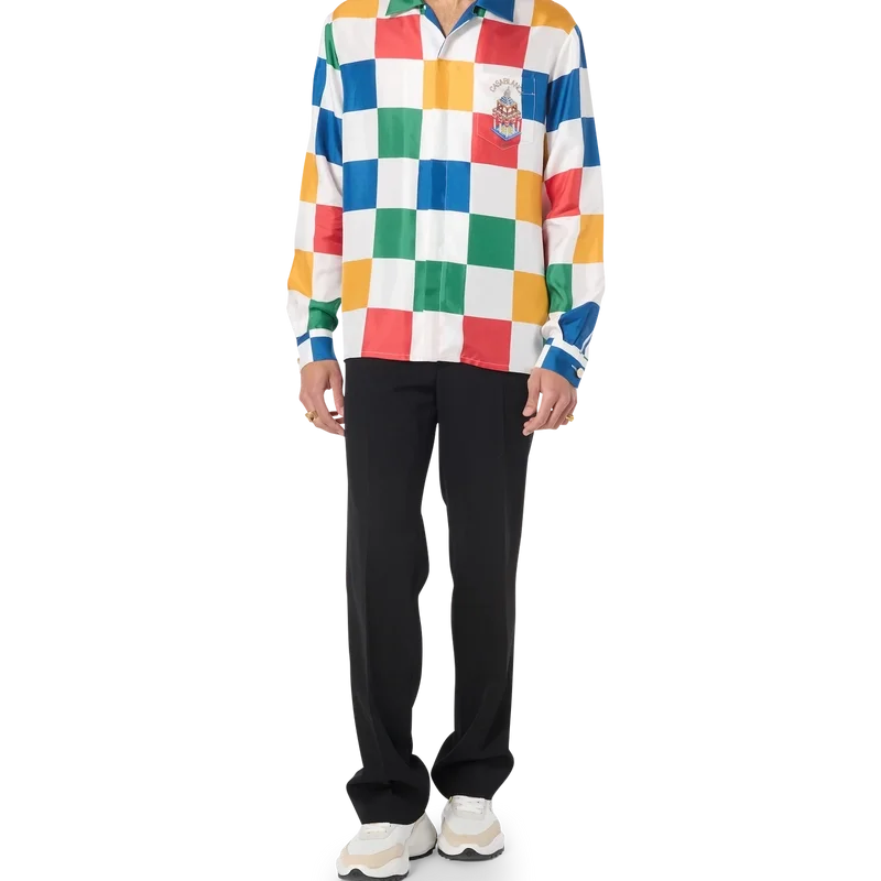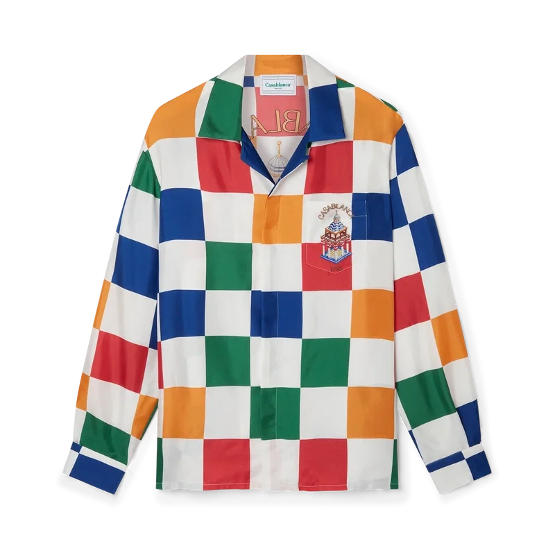 Das Seidenhemd „Casablanca Primary Check“ ist ein bedrucktes Langarmmodell mit durchgehendem Schachbrettmuster – eine Anspielung auf arabische Tischspiele. Abgerundet durch saisonale Motive auf dem Rücken und der Brusttasche. Mit einem Kragen, der offen getragen werden soll, und einer Knopfleiste vorne.