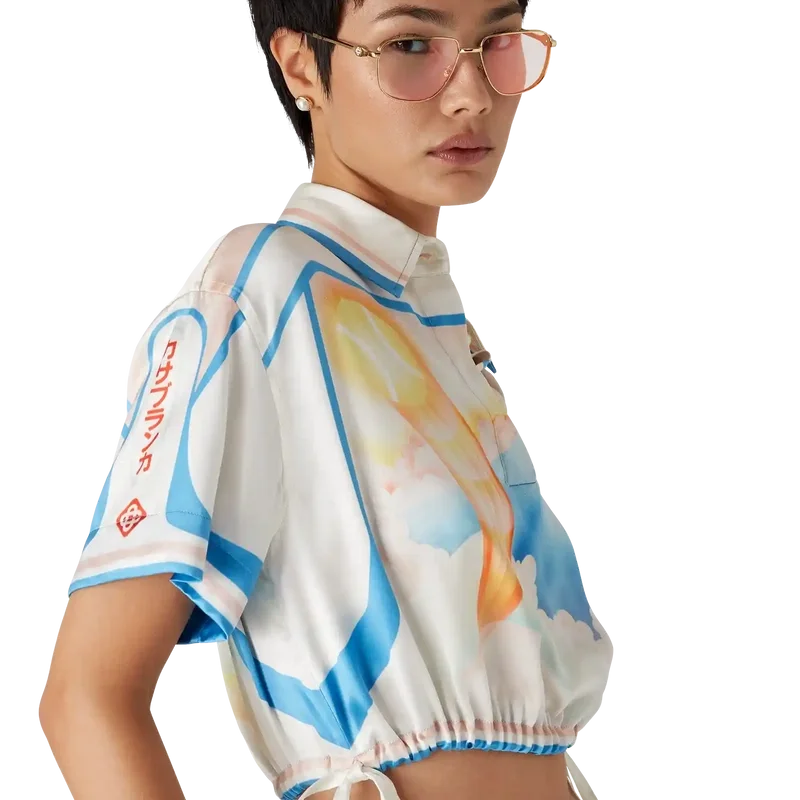 Das Fuji Dream Satin-Cropped-Shirt ist ein kurzärmeliges, bedrucktes Modell mit einem Motiv, das eine traumhafte Vision einer Reise zum Fuji zeigt – gefertigt aus Satin. Mit Spitzkragen, Knopfleiste, Corozo-Knöpfen mit Interlocking-CC-Logo und Kordelverschlüssen an den Seiten.