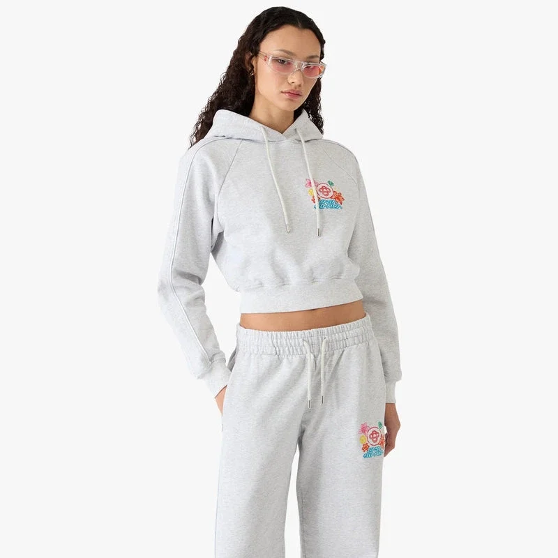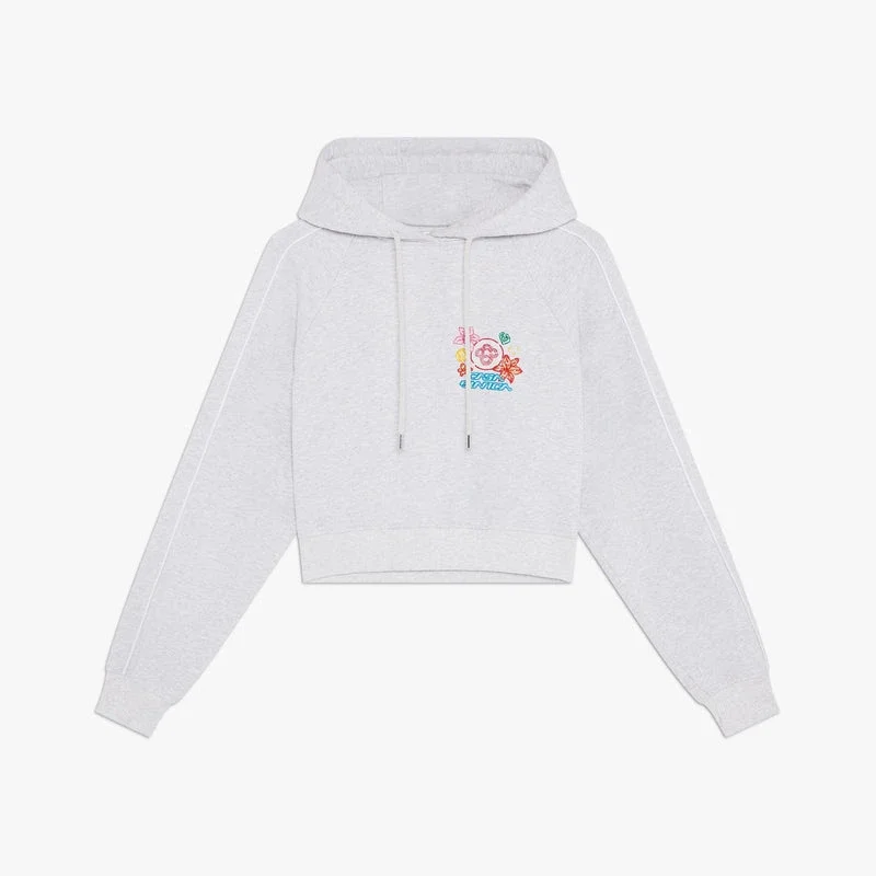 Das graue, bestickte, verkürzte Kapuzensweatshirt ist ein raffiniertes Design mit der grafischen Collage der Saison, die die Ikonografie und Designelemente der neuen Saison mit Interpretationen des Logos, des Smileys und der Orchideenblüte darstellt. Abgerundet wird es durch eine Kapuze, einen Kordelzug, Paspeldetails an den Raglanärmeln, gerippte Bündchen und Saumdetails sowie eine kurze Silhouette, die die Sport- und Freizeit-Codes des Hauses verkörpert.