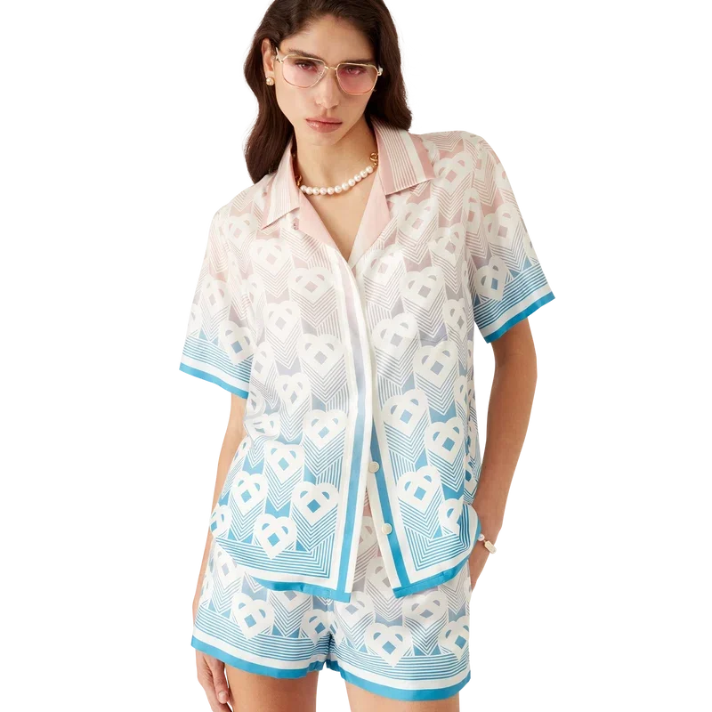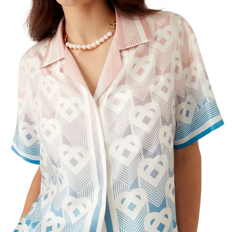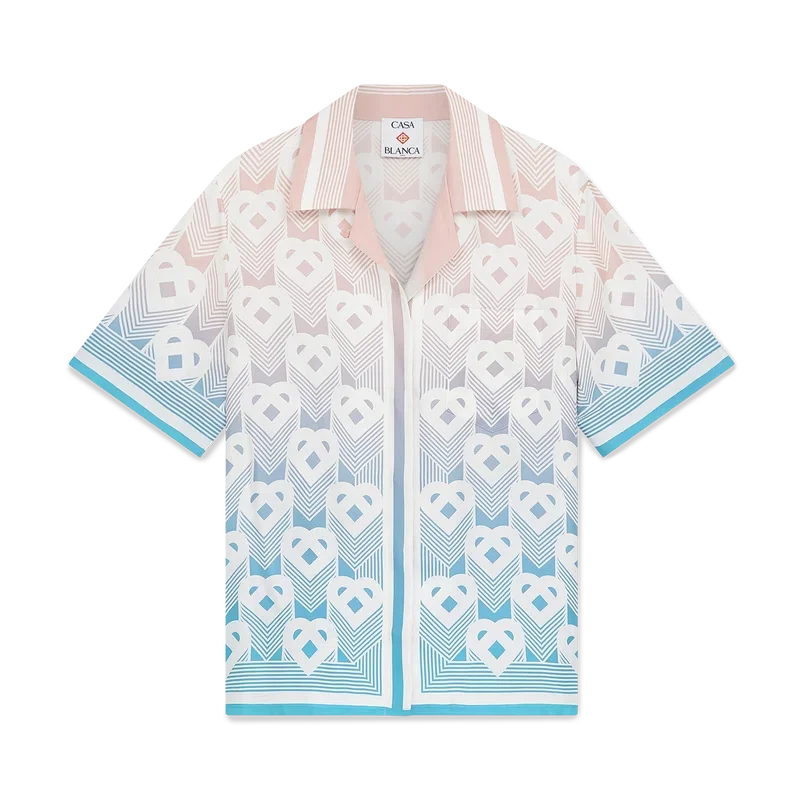 Das Kurzarm-Shirt aus Seide mit Herz-Monogramm im Farbverlauf ist ein durchgehend bedrucktes Design, das das Herz-Monogramm des Hauses auf einem rosa-blauen Hintergrund im Farbverlauf zeigt. Es ist aus einem Monogramm-Seidentwill gefertigt und mit einem Kubanerkragen, einer Brusttasche sowie Kragen, Manschetten, Saum und Knopfleiste mit Streifenverzierung versehen.