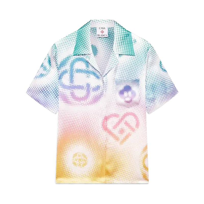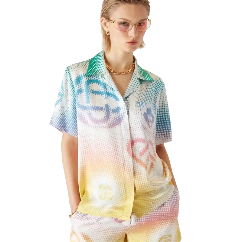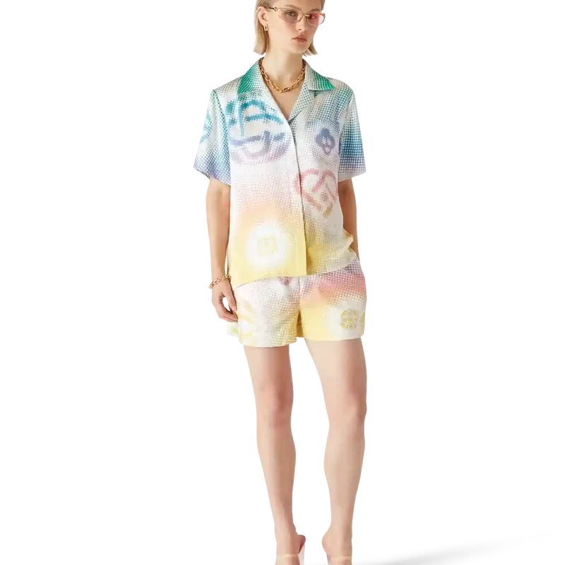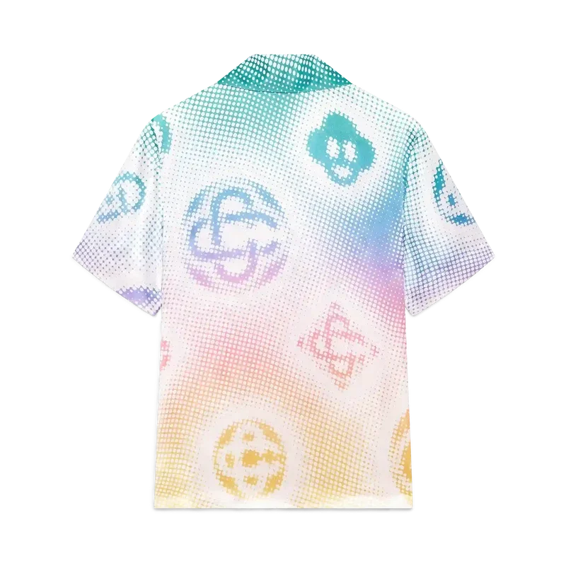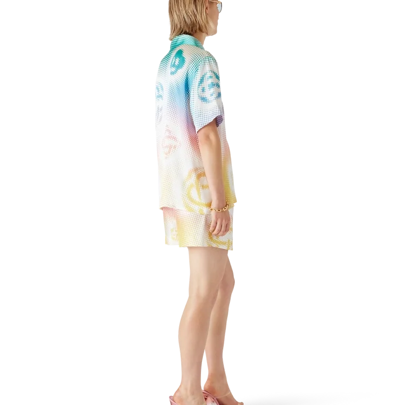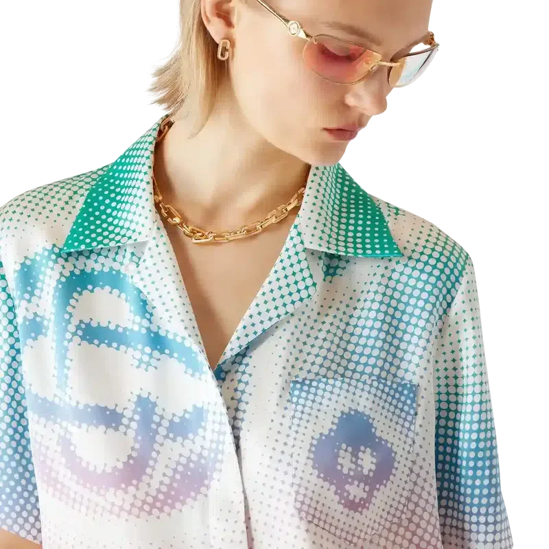 Das Kurzarmhemd mit Halbton-Logo ist ein durchgehend bedrucktes Design mit Monogramm-Motiven des Hauses, die mittels Airbrush-Technik aufgebracht wurden und auf unseren früheren Experimenten mit dieser Technik aufbauen. Abgerundet wird es durch einen Kubanerkragen, einen Knopfverschluss, eine Brusttasche und Corozo-Knöpfe mit ineinander verschlungenem CC-Logo.