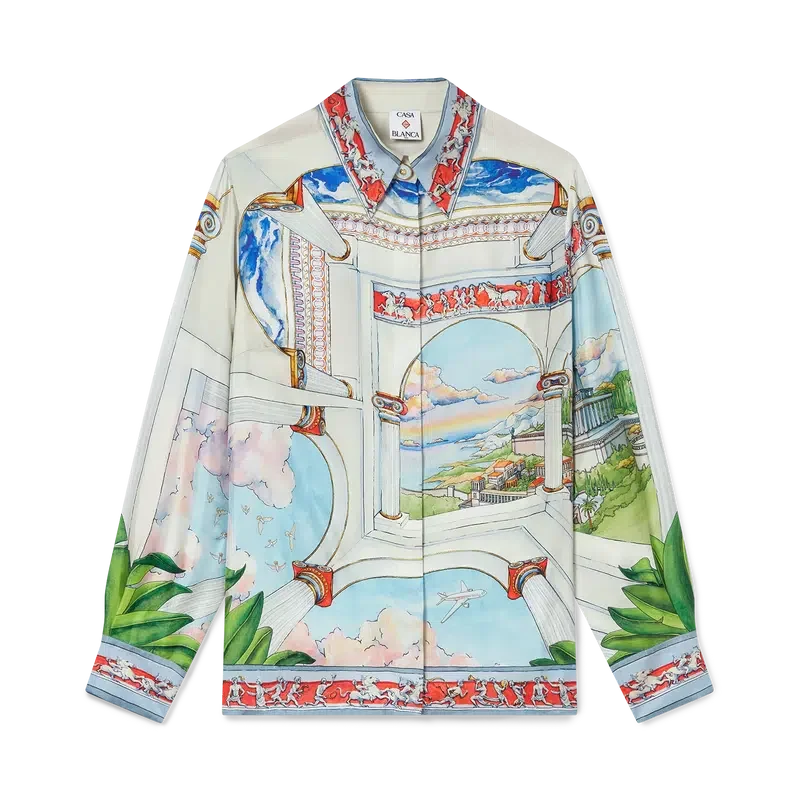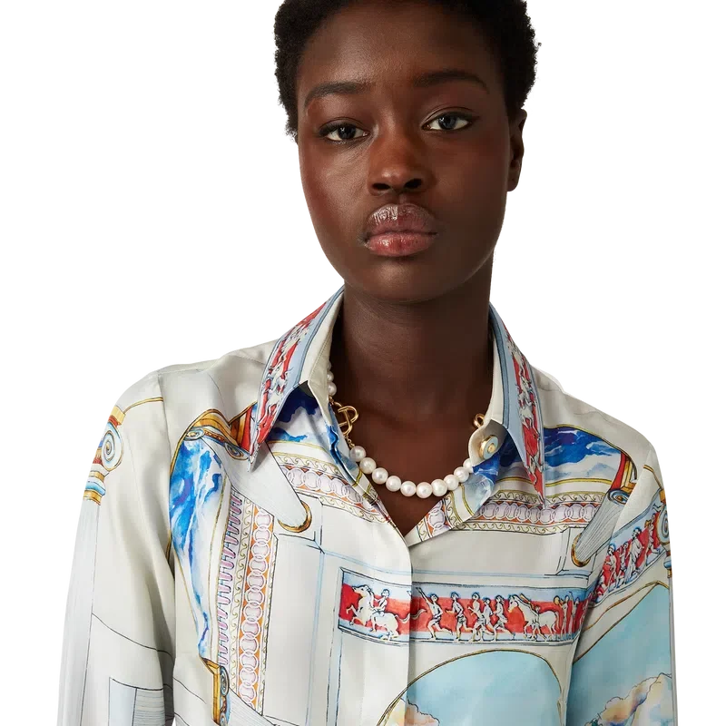 Das Seidenhemd „Le Passage“ ist ein langärmeliges Modell aus Seidentwill, das mit dem saisonalen Kunstwerk des Hauses verziert ist – es präsentiert vier verschiedene Dimensionen, die mit Perspektiven und Architektur spielen. Mit Kragen, Knopfleiste, Corozo-Knöpfen mit „Interlocking Cc“-Logo, charakteristischen goldumrandeten Perlenknöpfen am Kragen und an den Manschetten sowie von griechischen Mustern inspirierten Kantenverzierungen an Kragen, Manschetten und Saum.