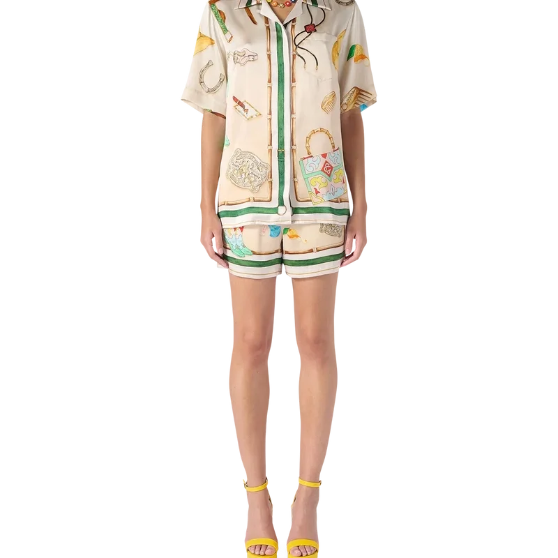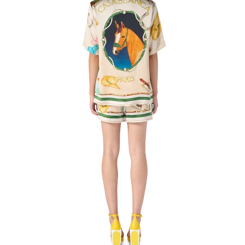 Das Seidenhemd mit kubanischem Kragen von L’ecurie Blanche ist ein bedrucktes Kurzarmmodell mit saisonaler Casablanca-Symbolik. Mit offenem Kragen, Casablanca Paris-Markenlabel und Knopfleiste vorne, entworfen für eine schmale Passform.
