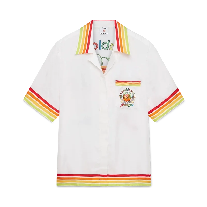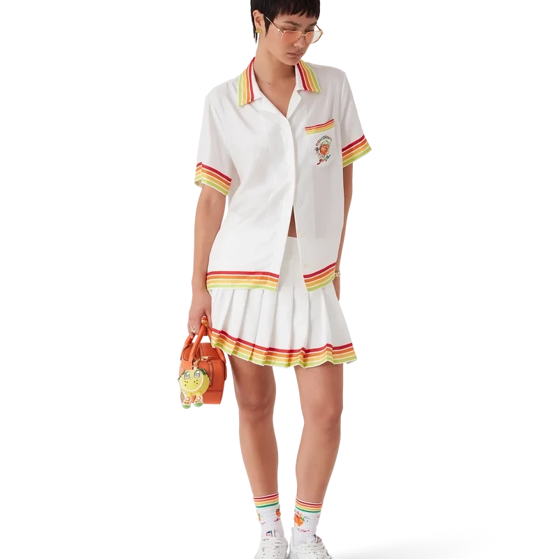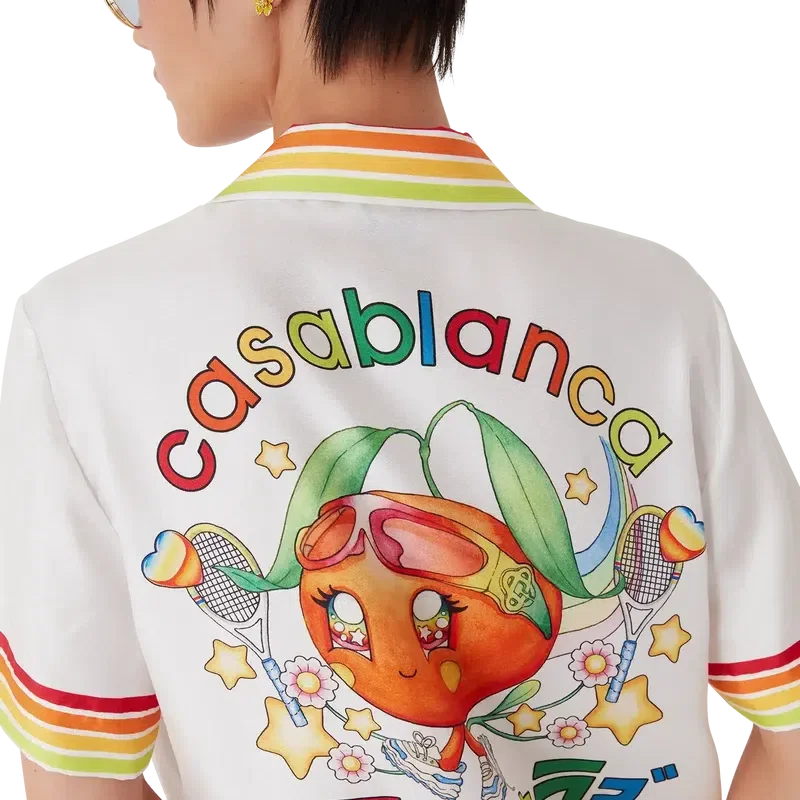 Das kurzärmelige Seidentwill-Hemd „Kawaii Orange Mascot“ ist ein bedrucktes Design mit saisonalen Motiven der „Kawaii Orange“ – diese als Orange gestaltete Figur ist eine Schlüsselfigur in unserem Universum und trägt Casa-Accessoires, eine Brille und Sneakers. Sie ist vor allem in den Damenmodellen der Kollektion zu sehen. Abgerundet durch einen Kubanerkragen, Knopfverschluss, Corozo-Knöpfe mit ineinander verschlungenem Cc-Logo, eine Brusttasche sowie rote, orangefarbene, gelbe und grüne Streifen als Kantenverzierung an Kragen, Manschetten, Saum und Tasche.