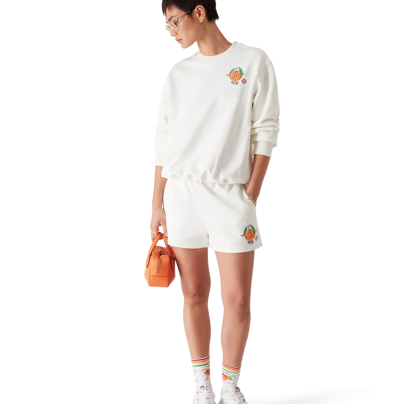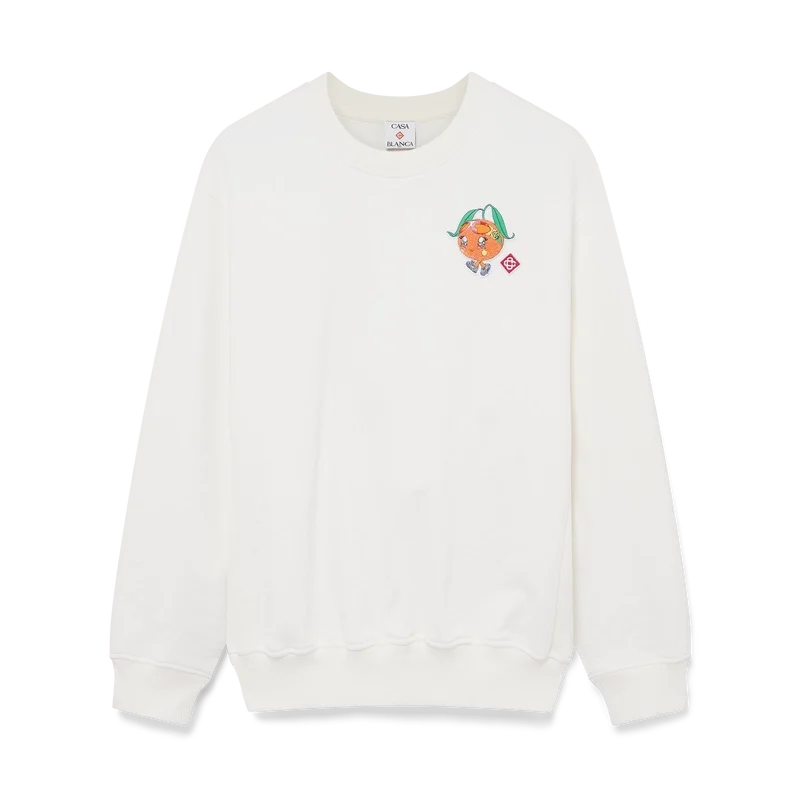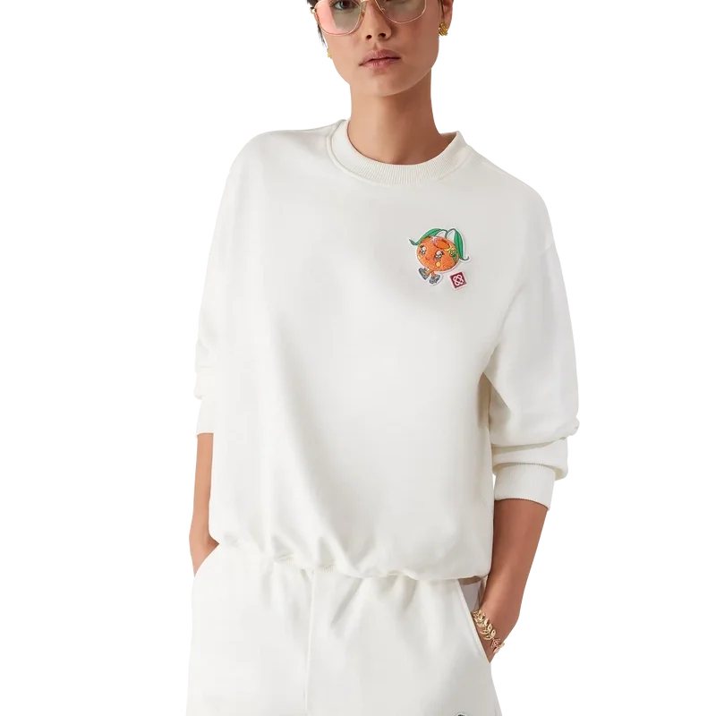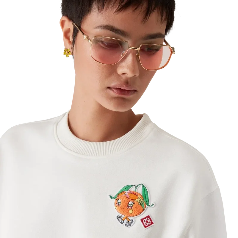Das orangefarbene Maskottchen-Sweatshirt ist ein langärmeliges Modell mit Stickmotiv, das das saisonale Design dieser Figur zeigt. Es ist als Orange gestaltet – eine weitere Schlüsselfigur in unserem Universum – und zeigt Casa-Accessoires, eine Brille und Sneakers – vor allem in den Looks der Damenmode zu sehen. Abgerundet wird das Design durch einen klassischen gerippten Rundhalsausschnitt sowie gerippte Bündchen und Saum.