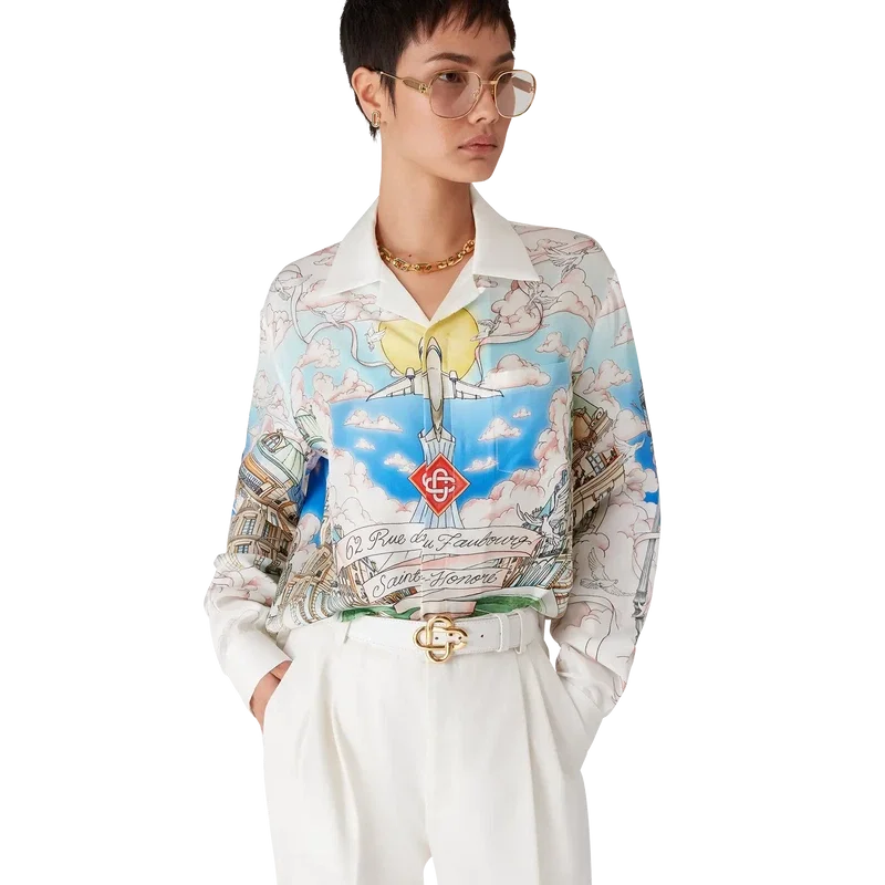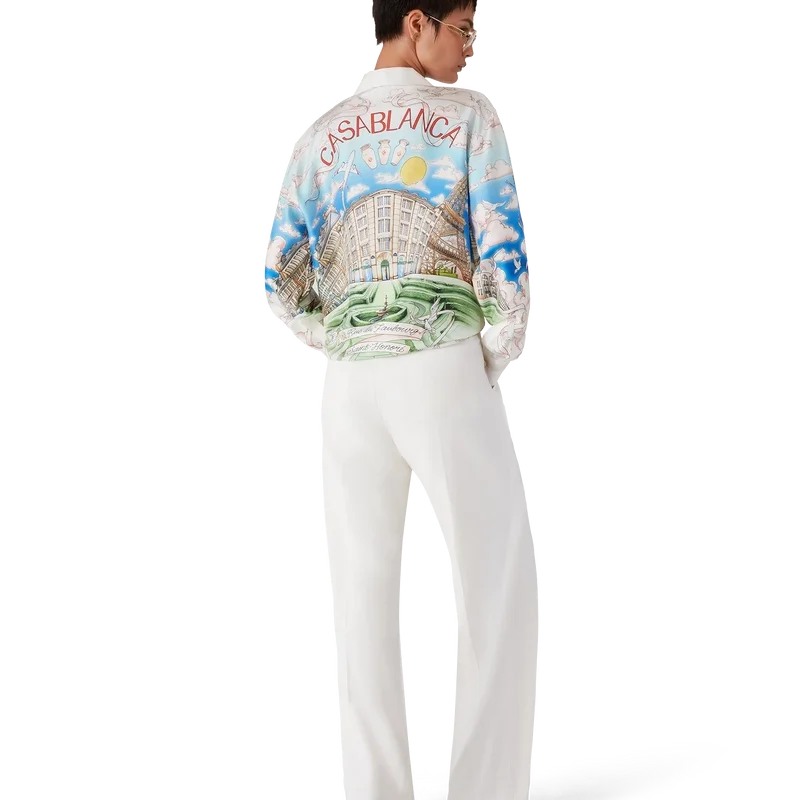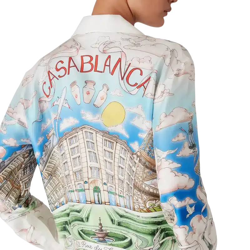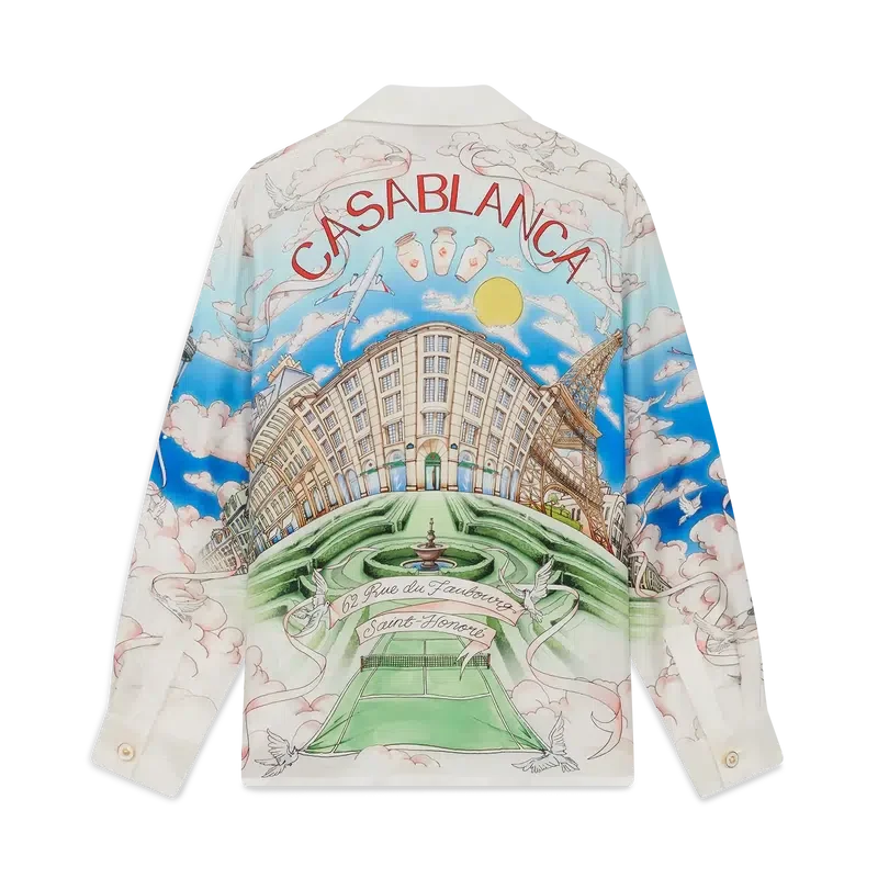 Das langärmelige Seidenhemd von La Vie Parisienne ist ein Modell mit Allover-Print, das exklusiv für unseren Flagship-Store entworfen wurde. Es zeigt ein Design, das von Architektur, Tennis, Natur und Reisen inspiriert ist und unseren Pariser Store in der Rue du Faubourg Saint-Honoré darstellt – einer der weltweit geschichtsträchtigsten Straßen für Mode und Design und ein Symbol für französische Eleganz und Raffinesse. Abgerundet wird das Design durch einen Kubanerkragen, einen Knopfverschluss, Corozo-Knöpfe mit dem ineinander verschlungenen Cc-Logo sowie emaillierte Knöpfe mit Goldrand an den Manschetten. Dieses Modell ist exklusiv auf Casablancaparis.Com und in unserem Pariser Store erhältlich.