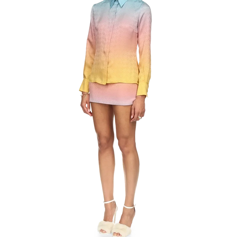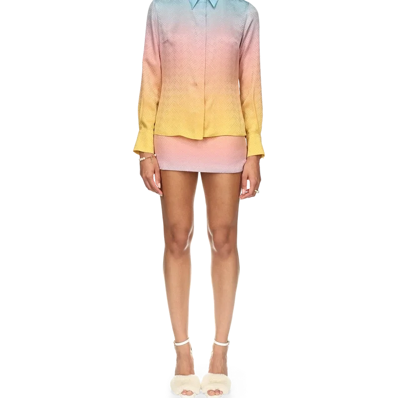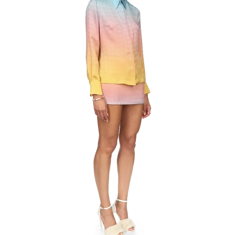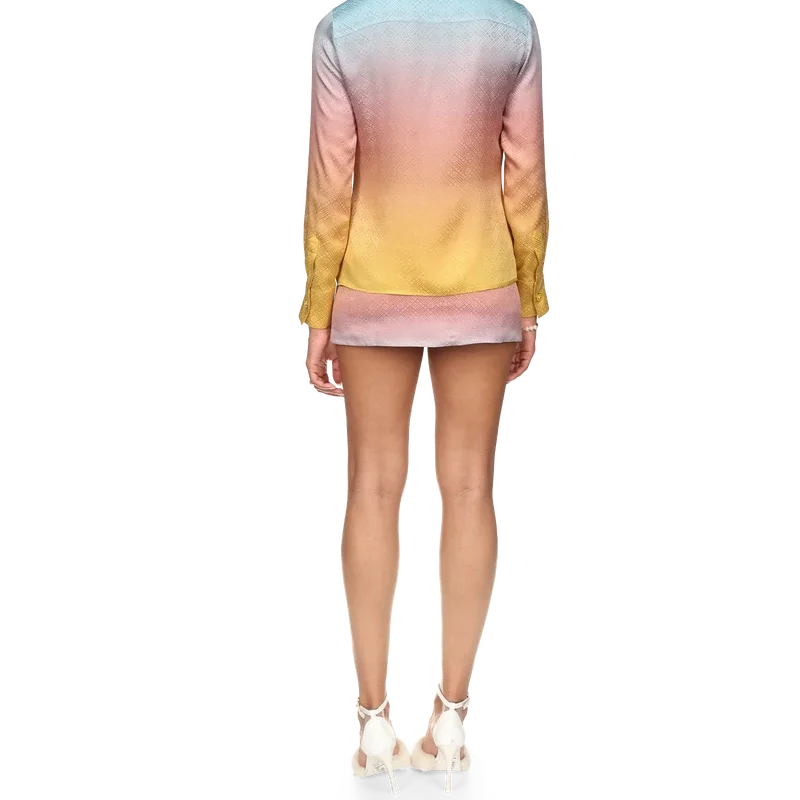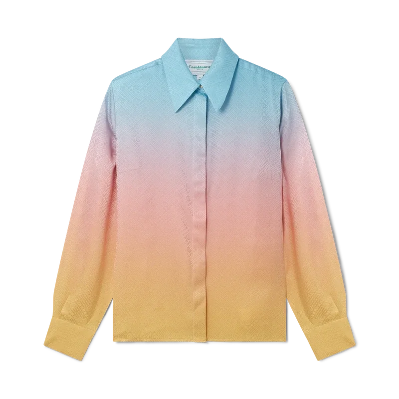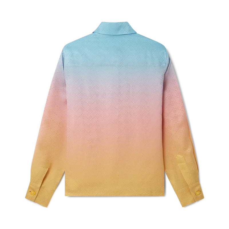 Das Ping Pong Gradient Seidenhemd ist ein durchgehend bedrucktes Design mit dem Ping Pong Monogramm-Ball in Bewegung, entnommen aus der Japan-Kollektion des Hauses. Dieses aus Seidentwill gefertigte Stück ist mit einer Knopfleiste vorne, goldrandigen Emaille-Knöpfen und einem Casablanca-Markenlabel versehen.