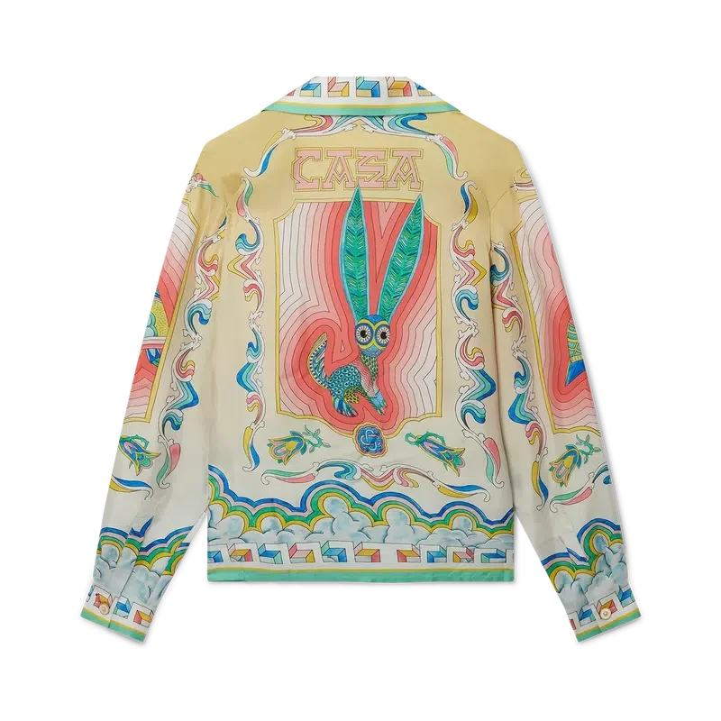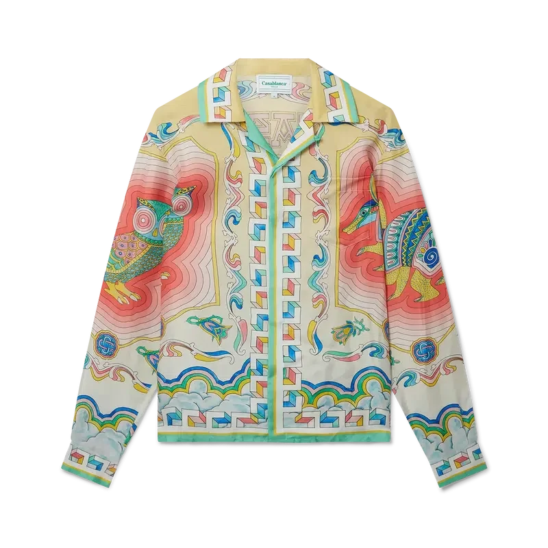 Das Souvenir-Seidenhemd mit kubanischem Kragen ist ein bedrucktes Langarmmodell mit einem aufwendig detaillierten Druck, der von den Werken des mexikanischen Künstlers Pedro Linares inspiriert ist. Hier sind die fantastischen Kreaturen Ausdruck einer halluzinatorischen Reise durch das Tierreich. Das Hemd aus 100 % Seide ist auf eine lockere Passform ausgelegt, wobei der Kragen im kubanischen Stil offen getragen werden soll.