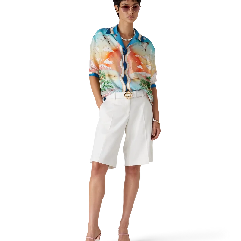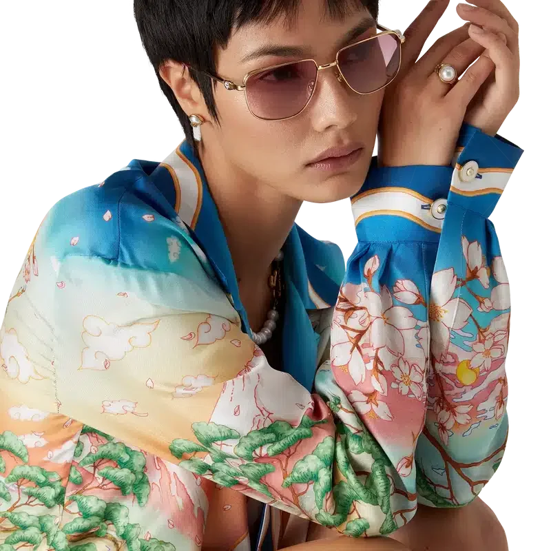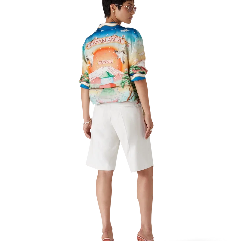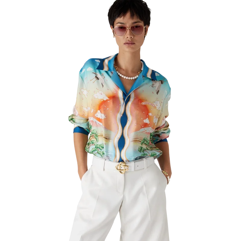 Das Tennis Club Seidenhemd ist ein langärmeliges, durchgehend bedrucktes Design mit der diesjährigen Version des Tennis Clubs. Es basiert auf unserem klassischen Layout, wird jedoch mit traditioneller japanischer Kunst kombiniert, was es zu einem Kleidungsstück mit starker Erzählkraft und einer wunderschönen Verschmelzung künstlerischer Stile macht. Hergestellt aus Seidentwill. Abgerundet durch einen Knopfverschluss, Corozo-Knöpfe mit ineinander verschlungenem Cc-Logo, charakteristische goldgeränderte Perlmuttknöpfe an Kragen und Manschetten sowie Streifen-Details am Saum, an den Manschetten, der Knopfleiste und am Kragen, die von Memphis-Wellen inspiriert sind.