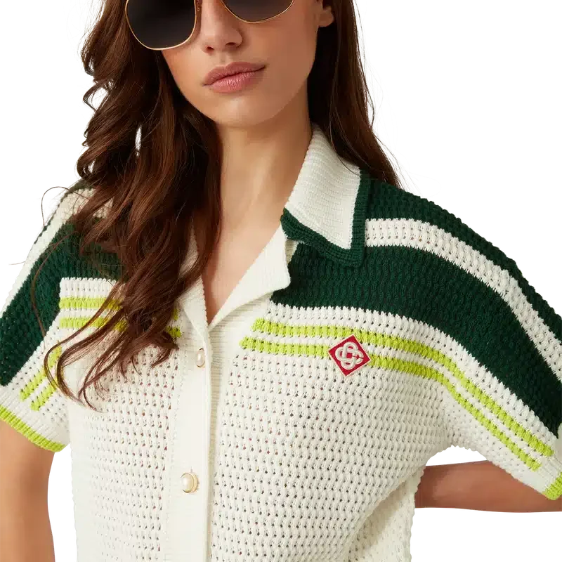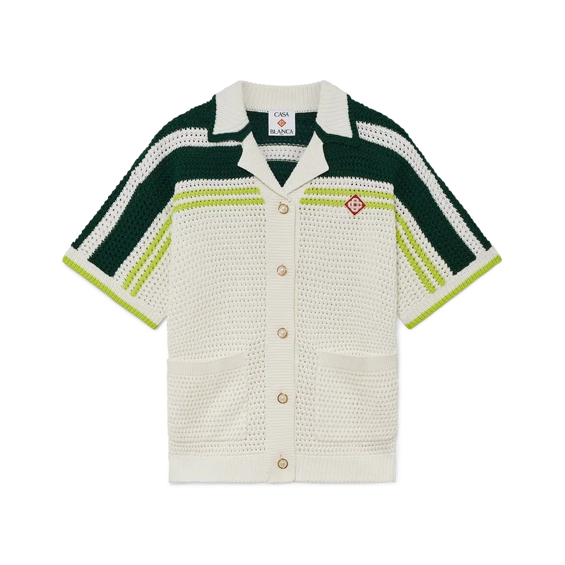 Das Tennis-Häkelhemd ist ein kurzärmeliges Strickmodell aus Baumwollstoff mit Häkeloptik und dem charakteristischen Rautenlogo des Hauses. Abgerundet wird es durch charakteristische goldene Perlenknöpfe, Streifendetails an den Schultern und entlang der Ärmel, aufgesetzte Taschen auf der Vorderseite sowie gestreifte Kanten am Kragen und an den Manschetten.