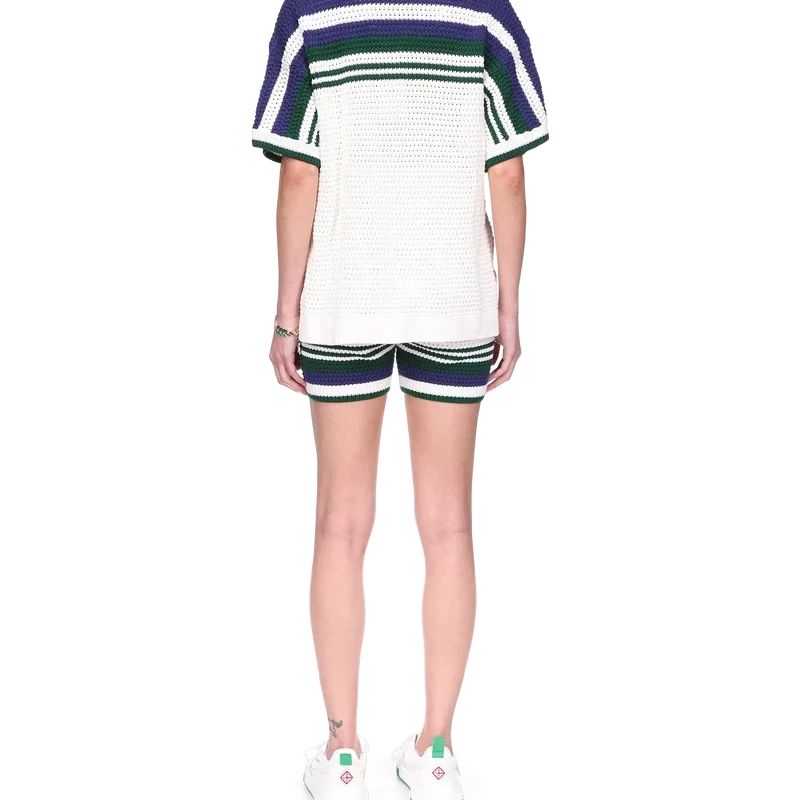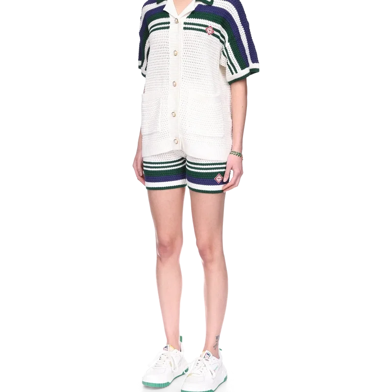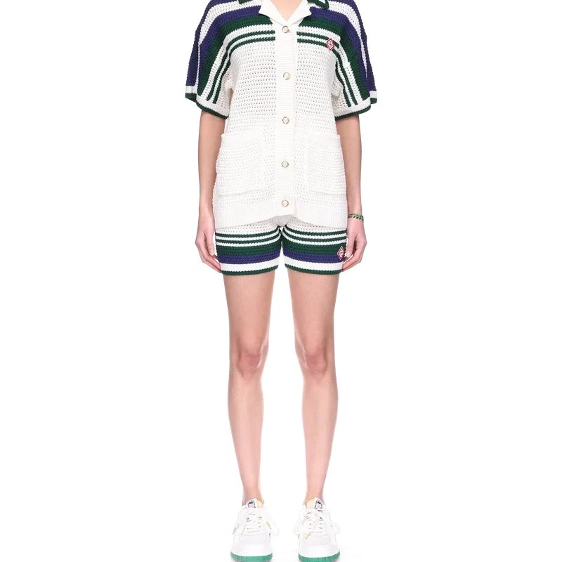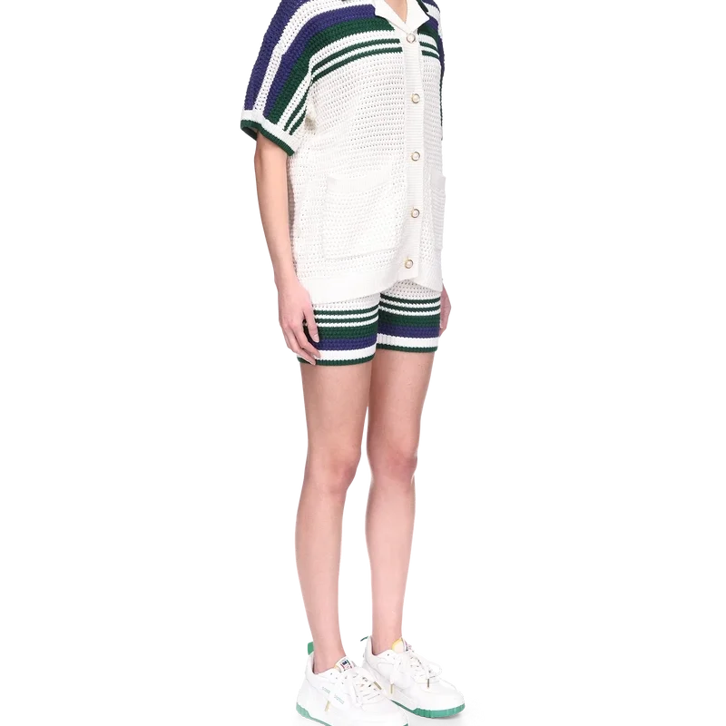 Das Tennis-Häkelhemd für Damen ist ein Modell aus gestrickter Baumwolle mit dem charakteristischen, ineinander verschlungenen Cc-Diamant-Logo des Hauses. Mit kontrastfarbener Einfassung an geripptem Kragen und Manschetten, Knopfverschluss, Streifenverzierung auf Brust, Schultern und Ärmeln, charakteristischen goldenen Perlenknöpfen und aufgesetzten Taschen vorne.