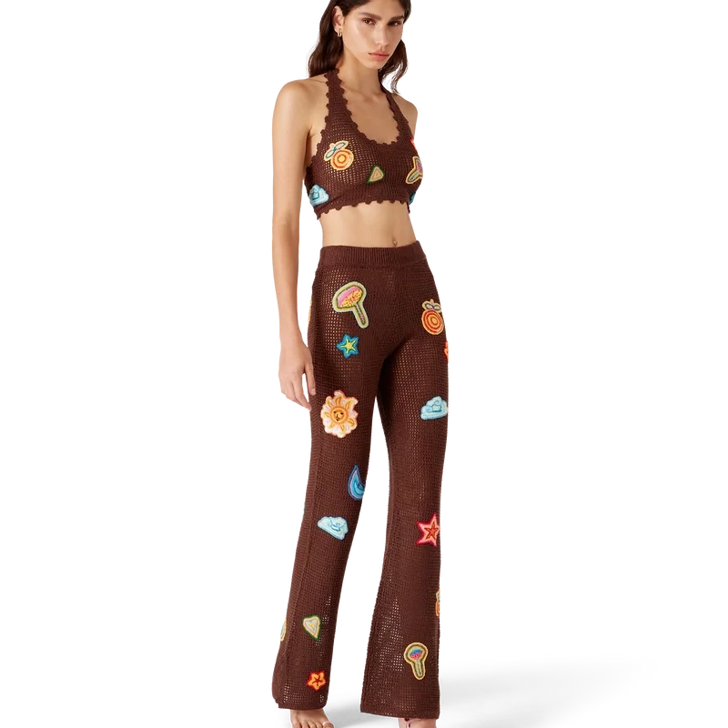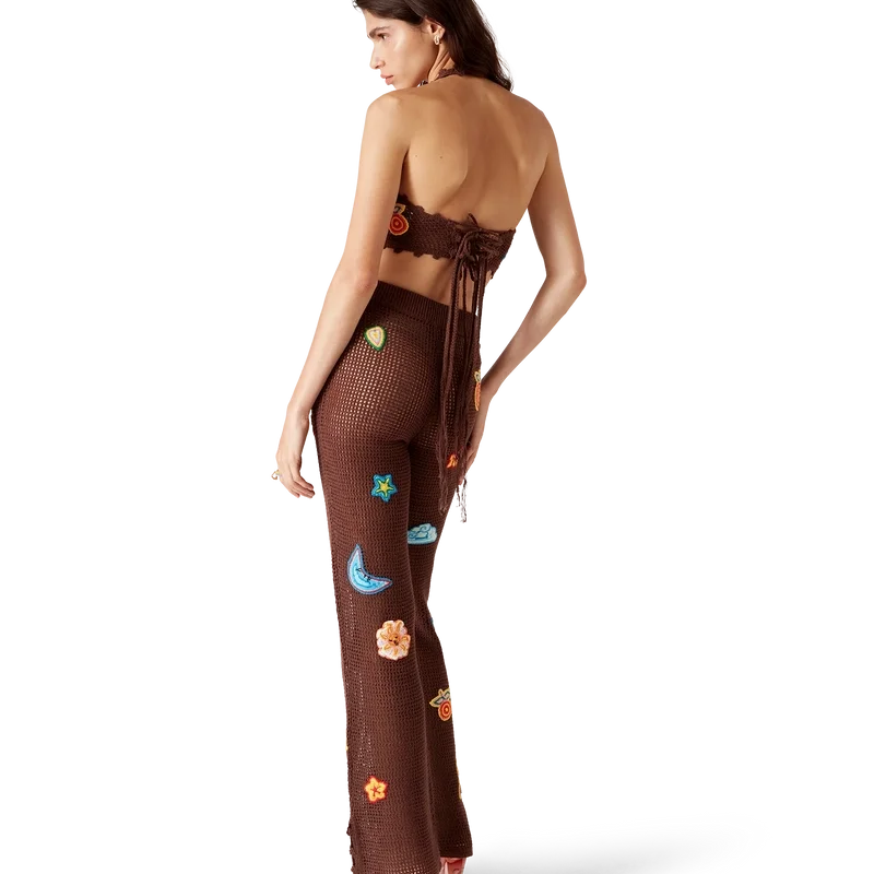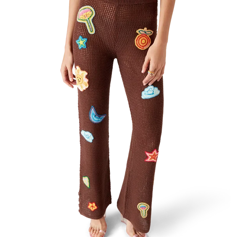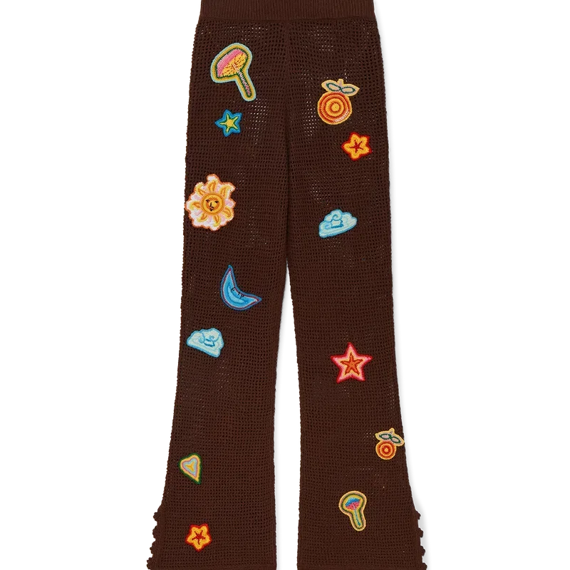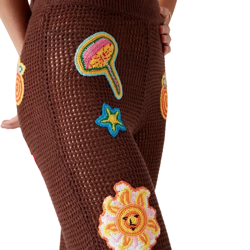 Die Hosen mit Häkel-Motiv sind ein Strickdesign aus einem offen gewebten Häkel-Baumwollstoff. Abgerundet durch einen elastischen Bund, Motive des klassischen Designelements des Hauses und Schlitzdetails an den Knöcheln.