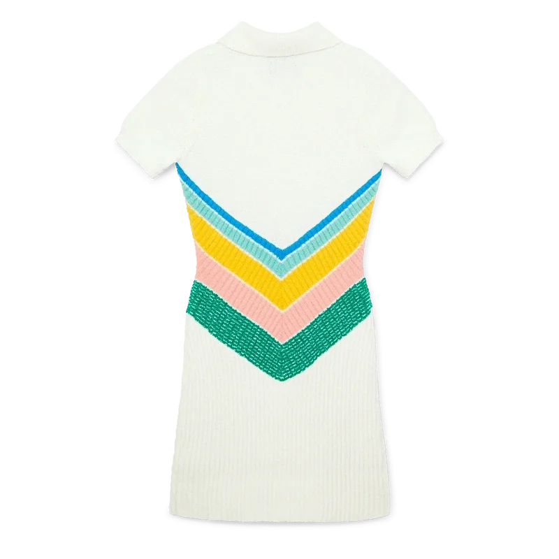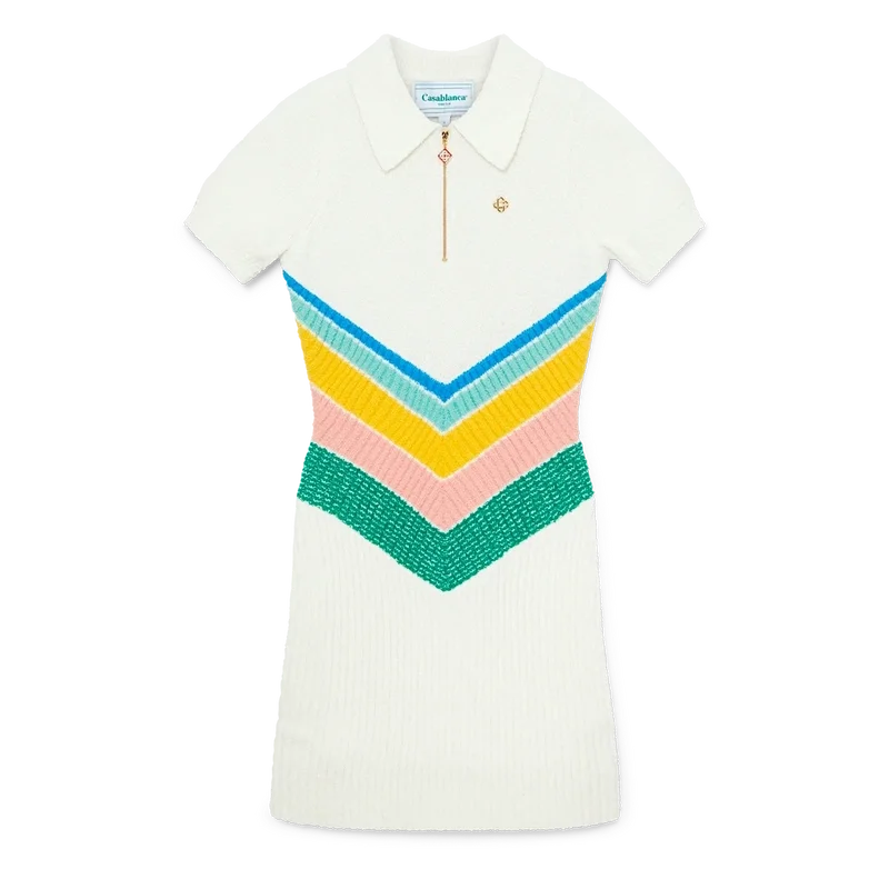 Das Bouclé-Chevron-Kleid ist ein kurzärmeliges, figurbetontes Kleid im Mini-Stil, gefertigt aus Bouclé-Stoff. Mit dem charakteristischen Rautenlogo des Hauses, einem Reißverschluss am Halsausschnitt, einem mehrfarbigen Chevron-Muster am Oberteil in den Pastellfarben dieser Saison, einem Kragen und einem gerippten Bouclé-Rockteil.