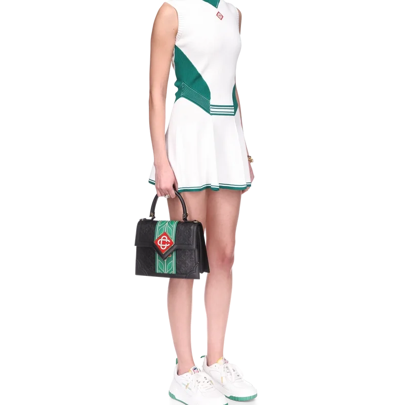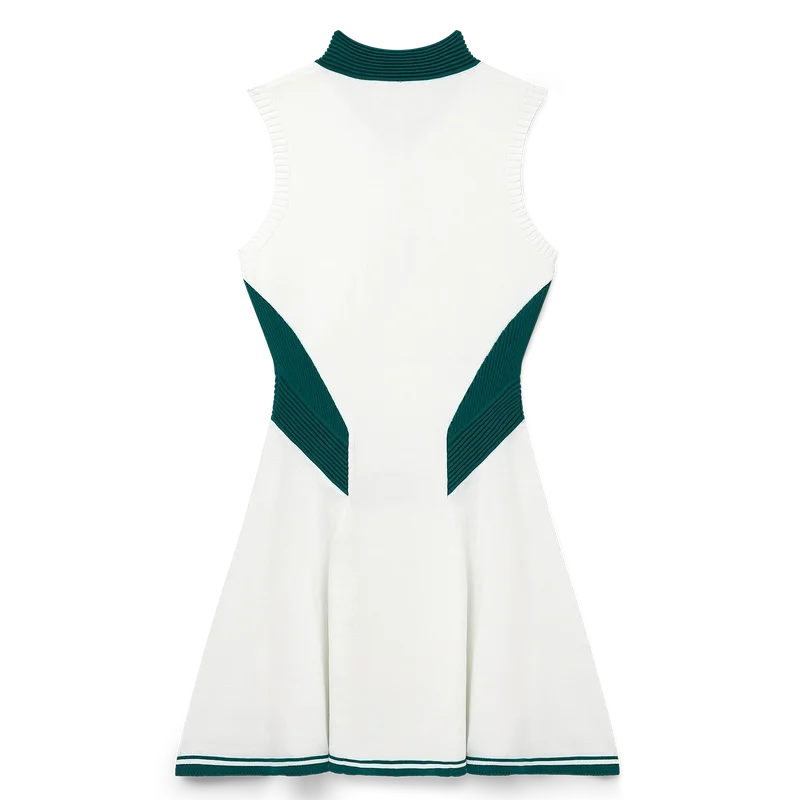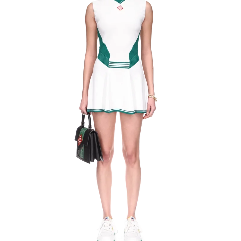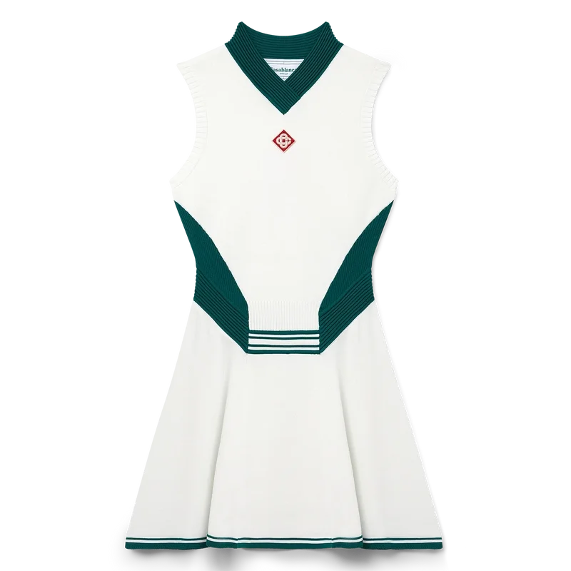 Das drapierte Tenniskleid ist ein ärmelloses Modell mit hohem V-Ausschnitt, inspiriert vom Tennis und gefertigt aus einem Strickstoff mit dem charakteristischen Diamant-Logo des Hauses auf der Brust. Abgerundet durch ein tailliertes Oberteil, eine tief sitzende Taille, einen Rock mit Einsätzen und kontrastierendem Saum sowie kontrastierende Rippdetails an Kragen, Seiteneinsätzen und Bund.