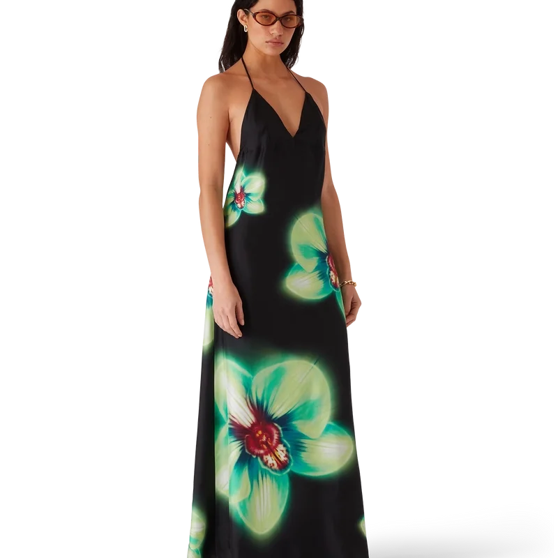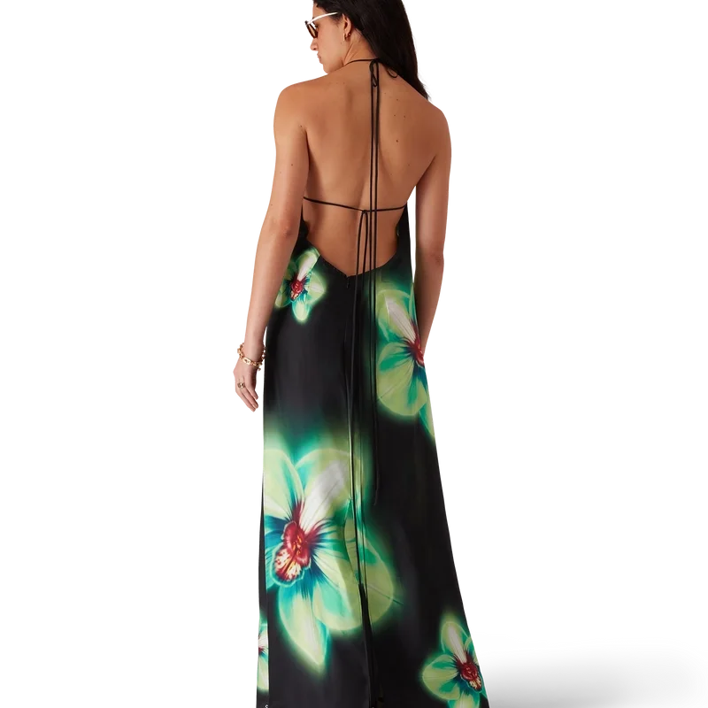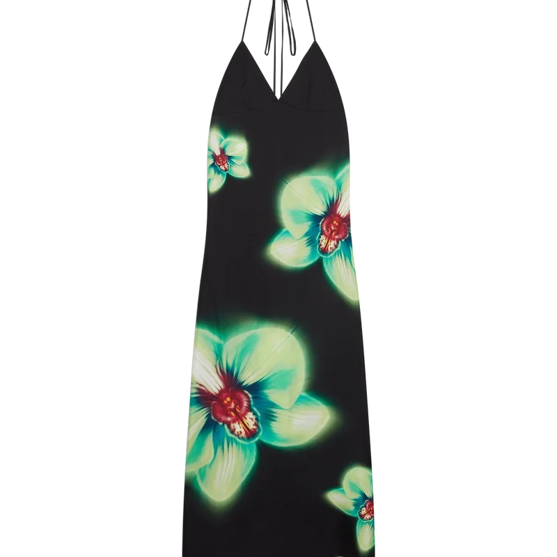 Das Orchid Glitch Seidenkleid ist ein Maxikleid im Neckholder-Stil, das die Blume der Saison – die Orchidee – in Airbrush-Technik darstellt. Das fertige Design verbindet grafische, sportliche Ästhetik mit Chrom-Branding. Abgerundet wird es durch Bindebänder am Hals und am Rücken sowie eine rückenfreie A-Linien-Silhouette.