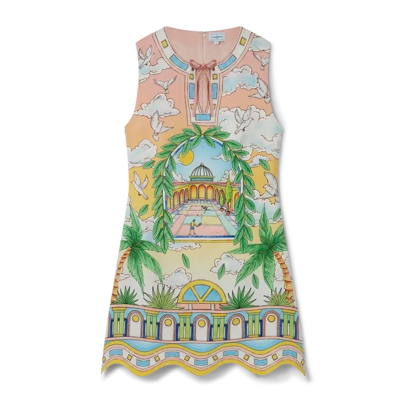Das Paysage Ideal Cocktailkleid ist ein ärmelloses Minikleid mit A-Linien-Silhouette, das mit saisonalen Motiven in einem traditionellen Layout verziert ist. Im Mittelpunkt stehen Bögen, Symmetrie und das ideale Universum von Casablanca, untermalt von einer hellen und idealistischen Farbpalette, die die für unsere Marke zentralen ätherischen Themen unterstreicht.