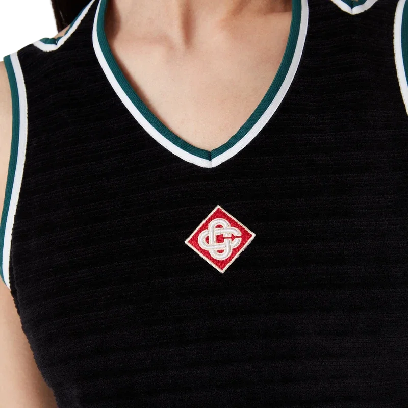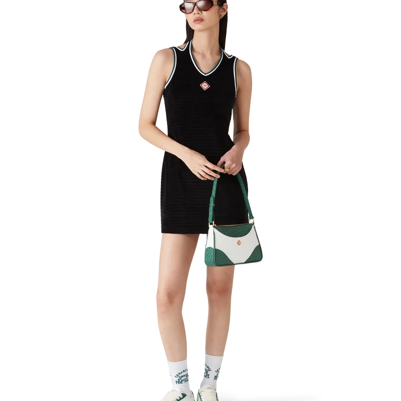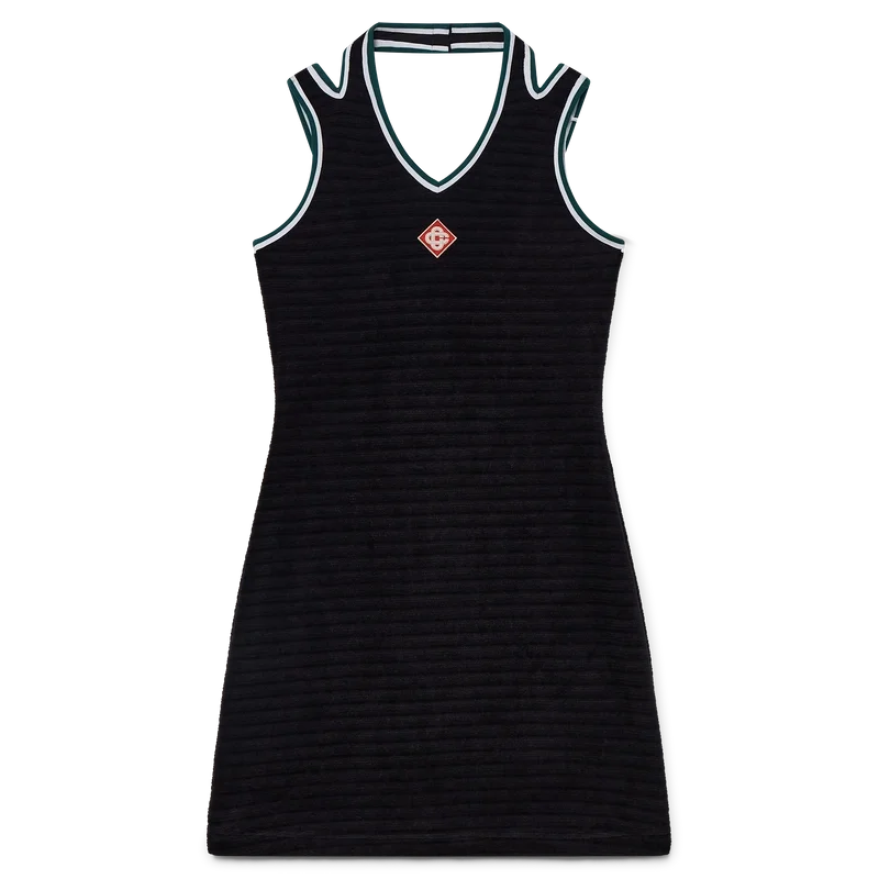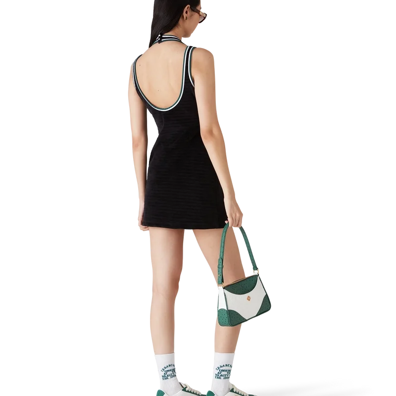 Das strukturierte Velours-Tenniskleid ist ein A-Linien-Minikleid aus Veloursstoff. Es verfügt über einen V-förmigen Neckholder-Ausschnitt, Schulterträger mit tiefem Rückenausschnitt und das charakteristische Rautenlogo des Hauses auf der Brust.