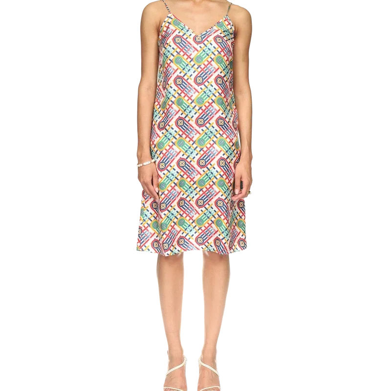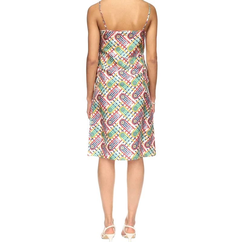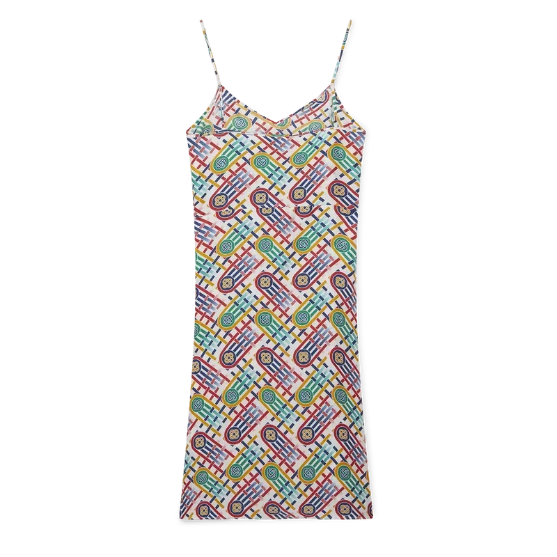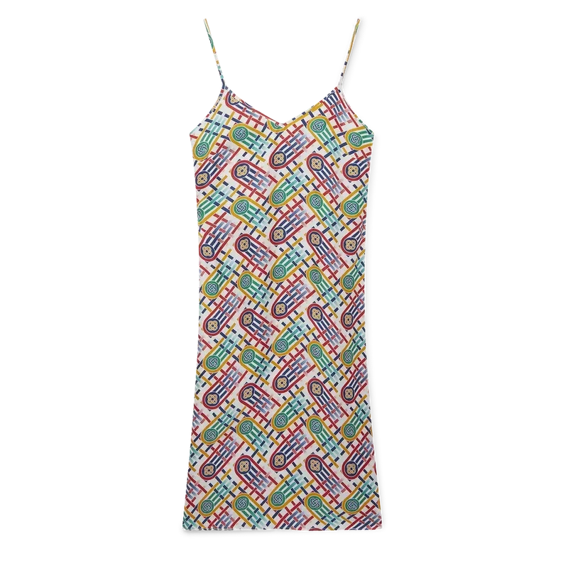 Das Tennis Monogram Seiden-Slipkleid zeigt das charakteristische Design des Hauses, neu interpretiert für die exklusive Nordstrom-Kollektion, die sich um moderne, vom Tennis inspirierte Athleisure-Mode dreht. Ausgestattet mit Spaghettiträgern und einem sanften V-Ausschnitt, leicht ausgestellt am mittellangen Rock.