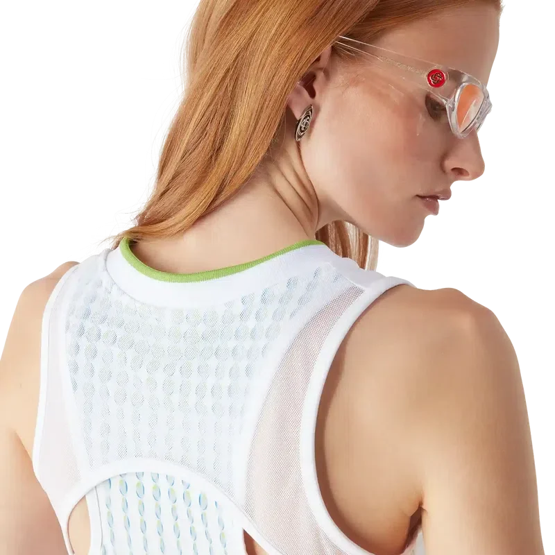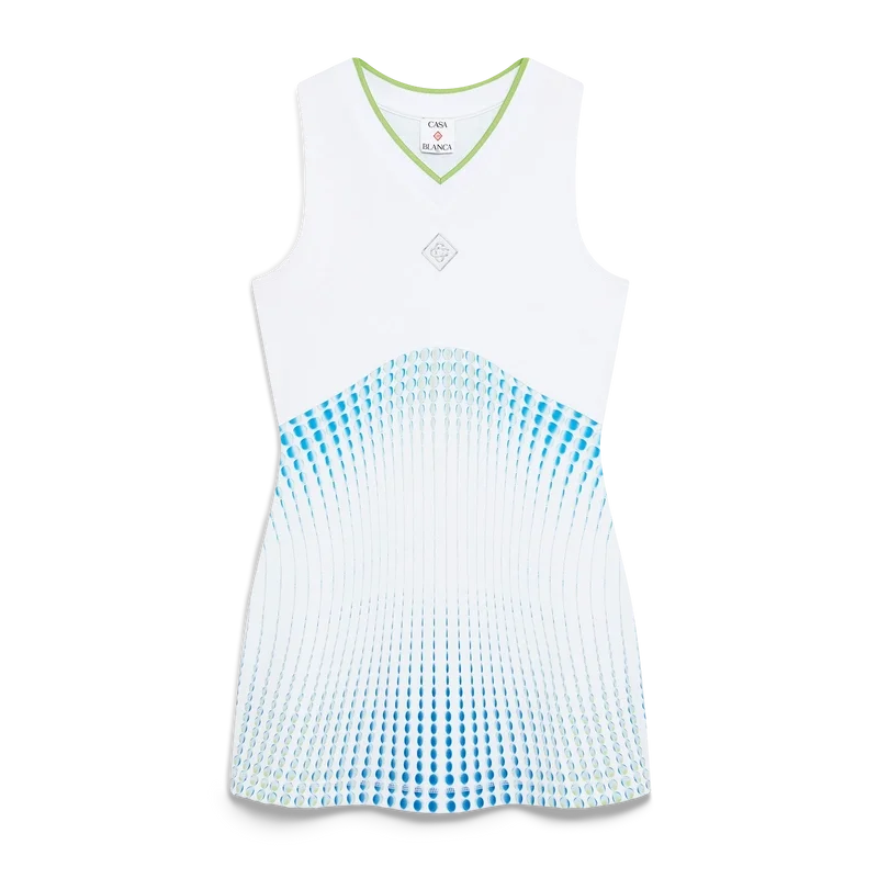 Das Racer-Kleid ist ein ärmelloses, bedrucktes Modell mit dem silbernen Diamant-Logo des Hauses in der Mitte, das in Zusammenarbeit mit Martin Naumann entworfen wurde, der für seine Arbeiten mit Farbverläufen und Textureffekten bekannt ist. Abgerundet durch einen kontrastierenden, flachen V-Ausschnitt, einen weißen Brustbereich und ein bedrucktes Oberteil.