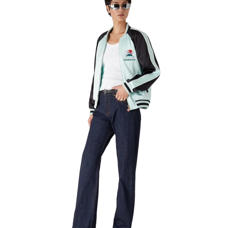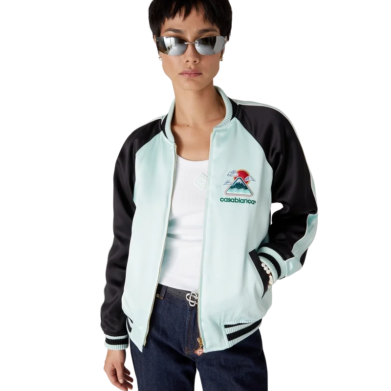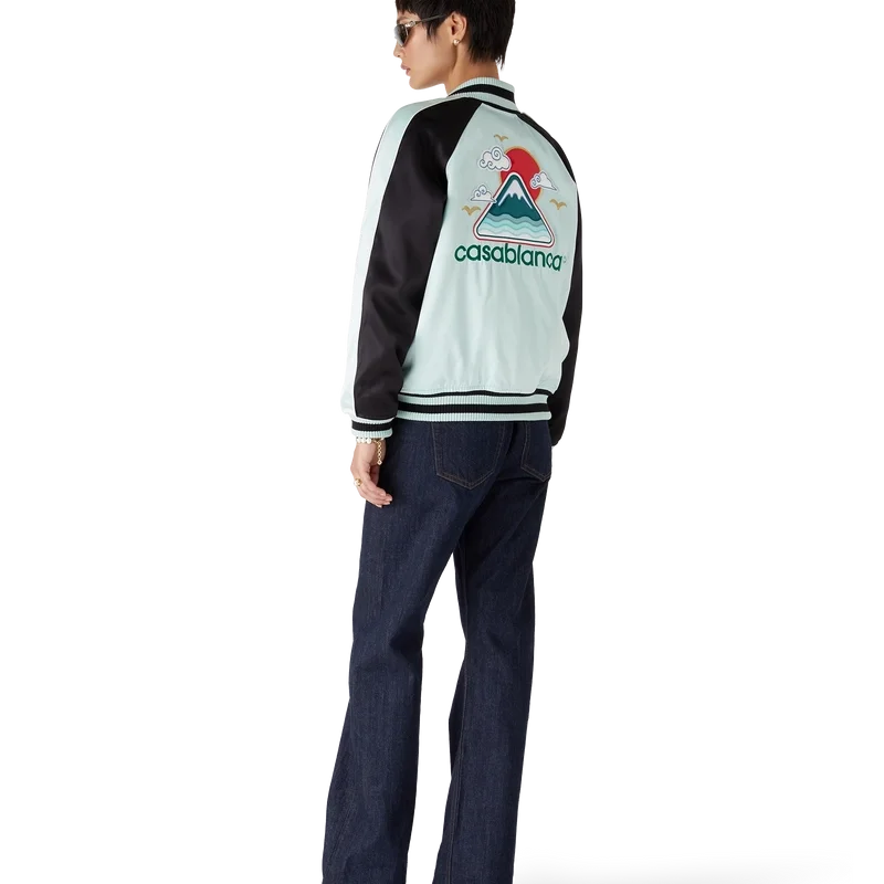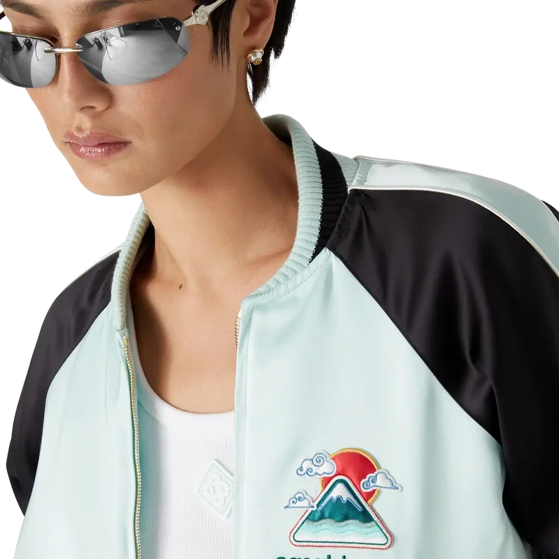Die bestickte Satin-Bomberjacke ist eine traditionelle Jacke im Bomber-Stil, gefertigt aus Satin mit einem Motiv, das von Japans reichhaltiger Ikonografie inspiriert ist. Mit nur wenigen Linien und Farben vermittelt sie eine starke visuelle Botschaft und ist damit eines der Aushängeschilder der Kollektion. Ausgestattet mit einem Reißverschluss mit dem charakteristischen Diamant-Logo des Hauses, Raglanärmeln mit grünen und schwarzen Einsätzen und Paspeldetails, einem Futter, schrägen Leistentaschen sowie einem gerippten Stehkragen, Manschetten und Saum mit mintfarbenen und schwarzen Streifen.
