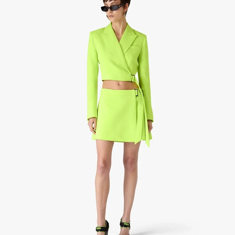 Die grüne, maßgeschneiderte Jacke aus Krepp ist ein raffiniertes, langärmeliges Modell mit Überkreuz-Design in einem leuchtenden Grünton. Sie verfügt über einen Gürtelverschluss, Revers, eine Brusttasche, einen Gürtelsaum, einen versilberten Schnallenverschluss und eine taillierte Silhouette, die den gehobenen Ansatz des Hauses für zeitgenössische Anzugmode verkörpert.