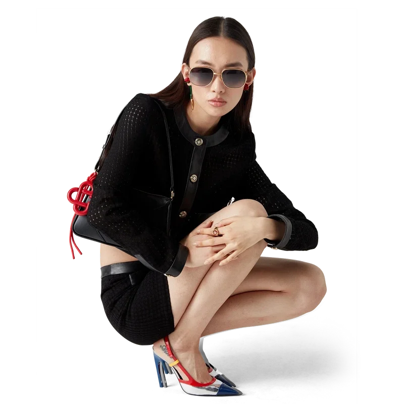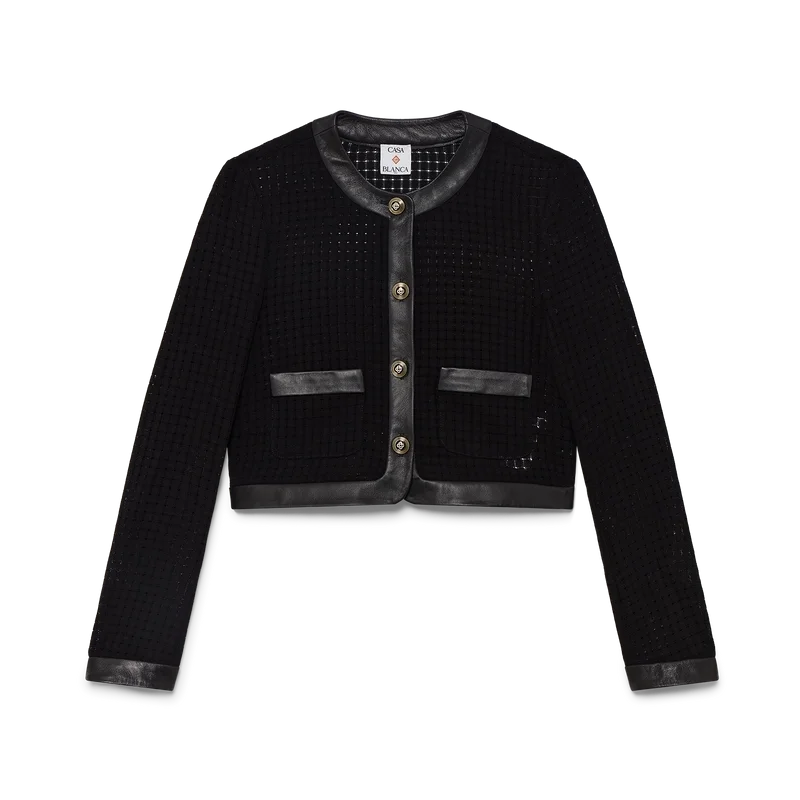 Die kurz geschnittene, taillierte Jacke mit offenem Gewebe ist ein kurzes Modell mit langen Ärmeln und ohne Kragen, gefertigt aus Cordonetto-Stoff. Mit Knopfleiste, charakteristischen goldumrandeten Perlmuttknöpfen, aufgesetzten Vordertaschen und Lederbesätzen.