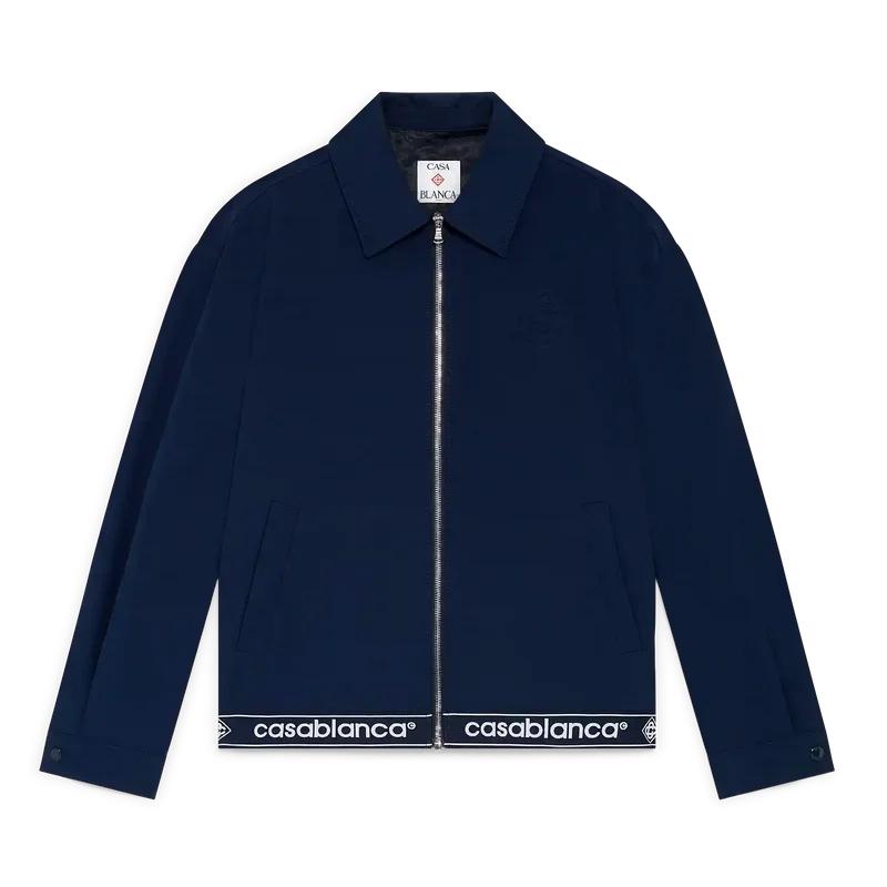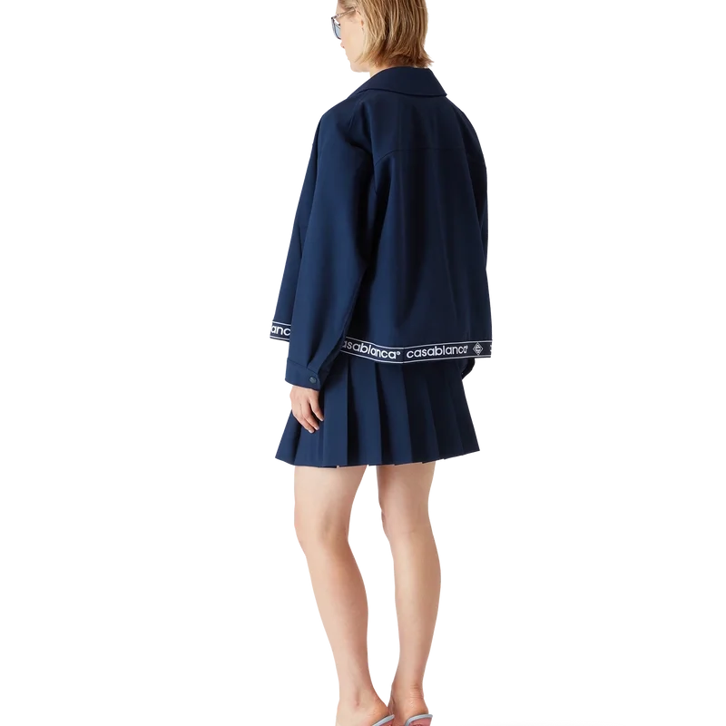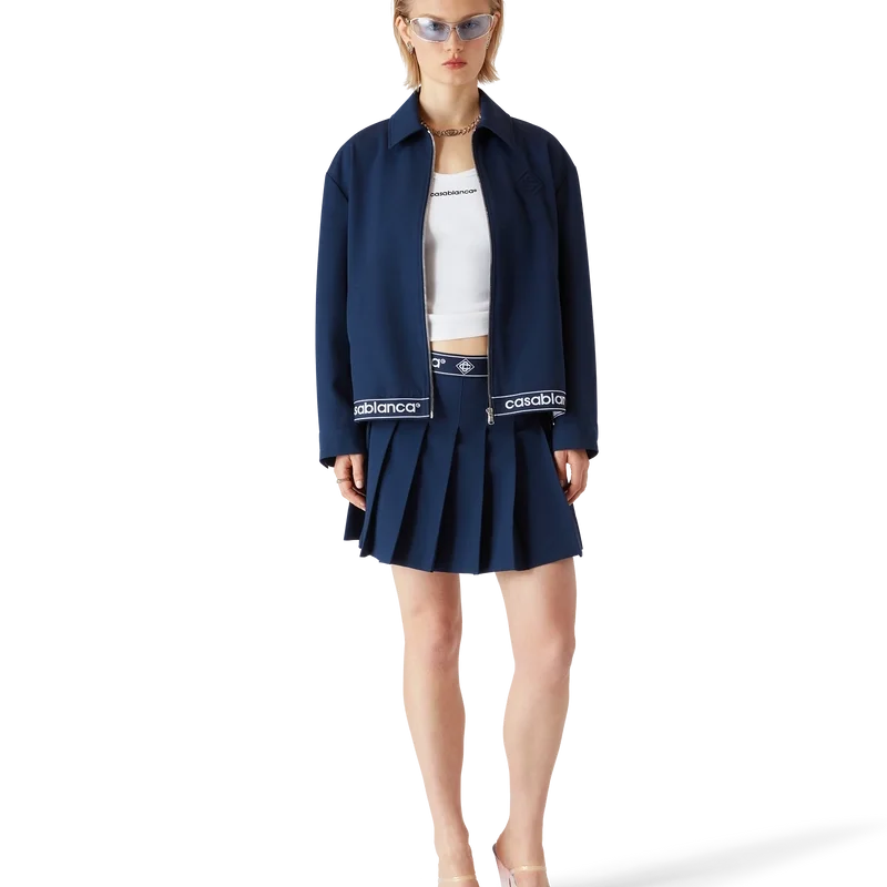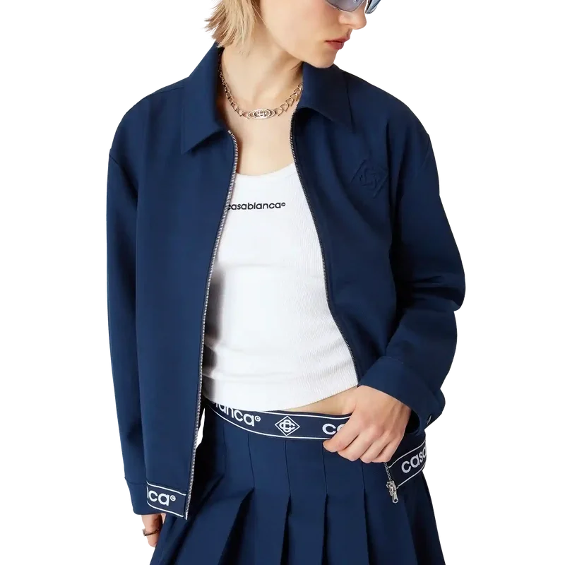 Die marineblaue Anzugjacke aus Wolle ist ein sportlich-elegantes Design aus einem Wollmischgewebe, das den raffinierten Ansatz des Hauses bei der Anzuggestaltung widerspiegelt. Mit Reißverschluss mit Diamond Monogram-Reißverschlusszug, spitzem Kragen, seitlichen Paspeltaschen, Saumdetail mit Casablanca-Logo und gestreiften Kanten.
