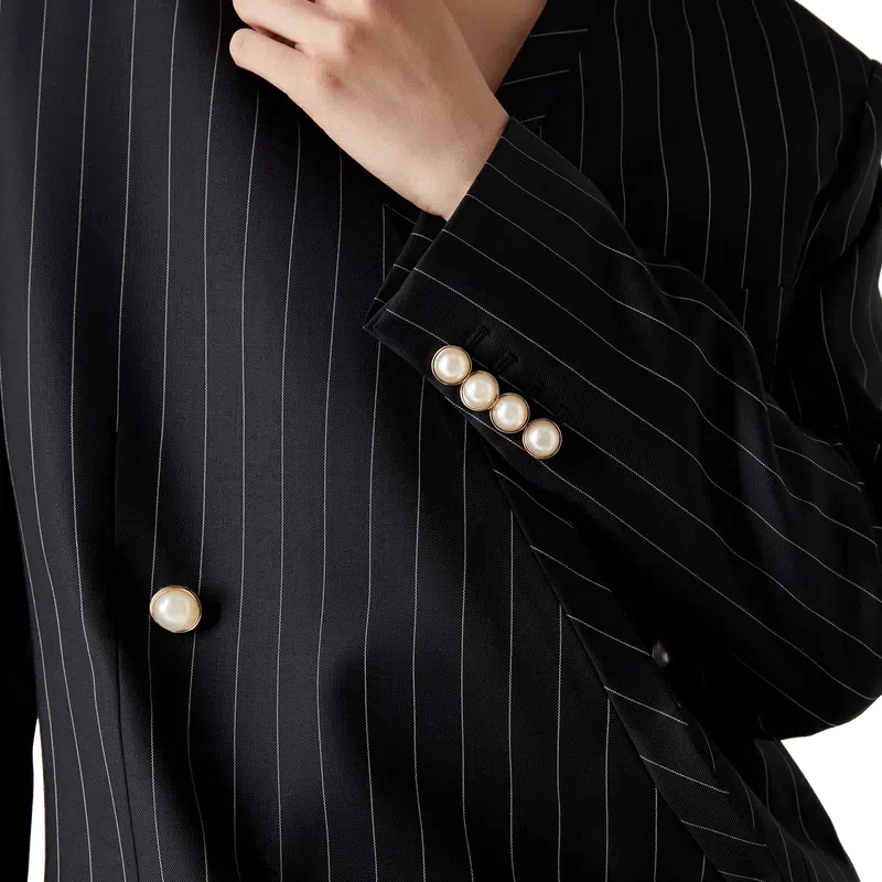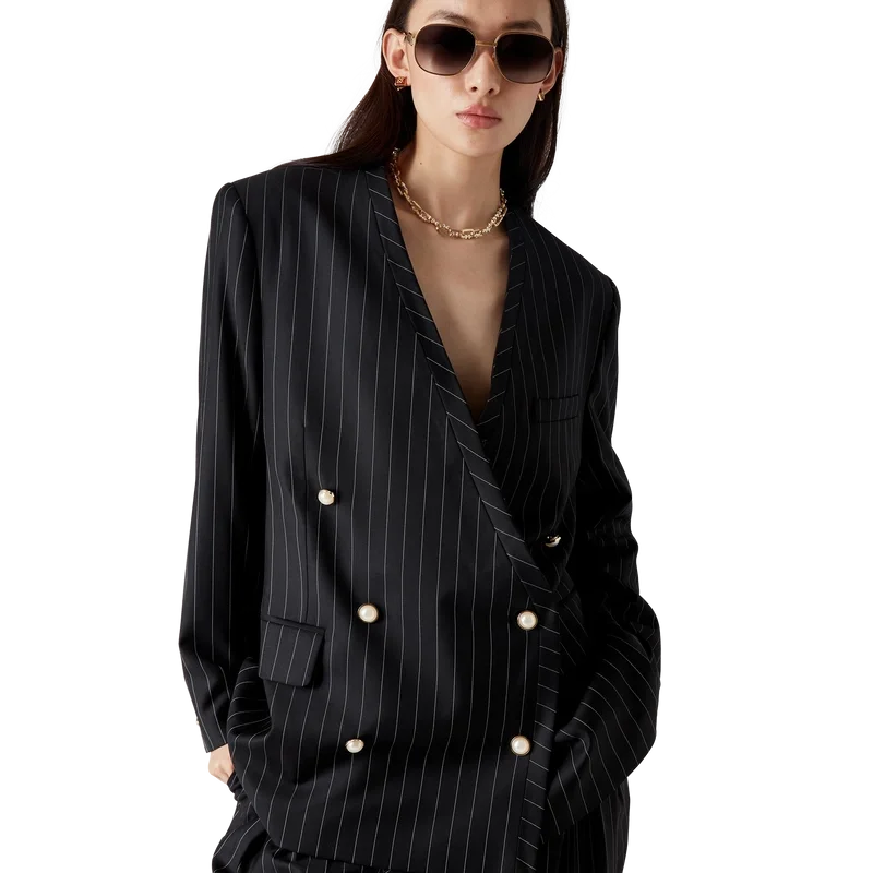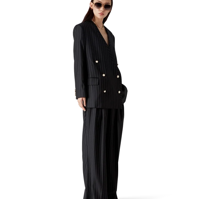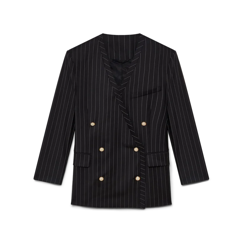 Der Oversize-Blazer aus Wolle mit Nadelstreifen ist ein kragenloses Zweireiher-Modell aus Schurwolle. Er verfügt über einen Knopfverschluss, goldgeränderte Perlmuttknöpfe, Pattentaschen vorne und einen Schlitz hinten.