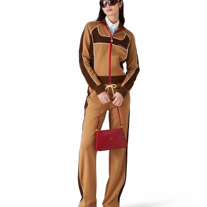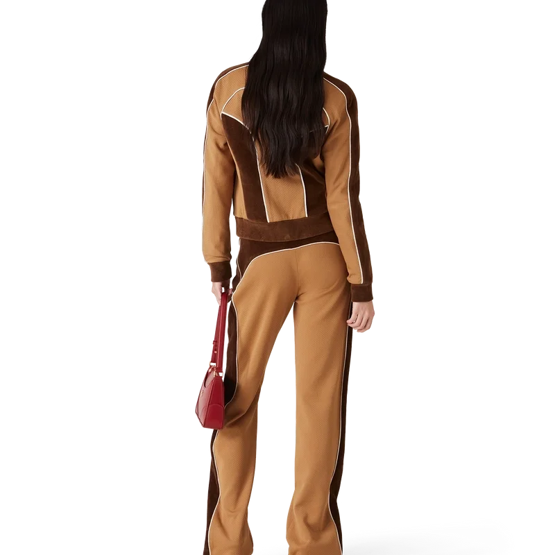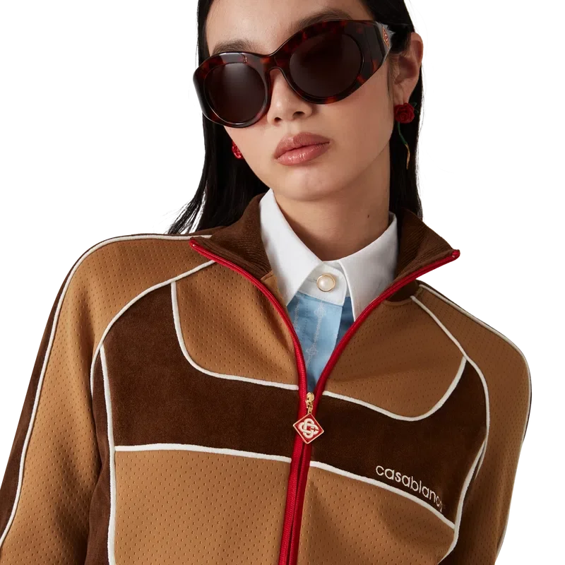 Die Chenille-Trackjacke mit Einsätzen ist ein von Sportbekleidung inspiriertes Design aus technischem Veloursstoff und verfügt über das charakteristische Rautenlogo des Hauses auf der Reißverschlusslasche. Abgerundet wird sie durch einen Reißverschluss, Einsätze mit weißen Paspeldetails sowie einen gerippten Kragen, Ärmelbündchen und Saum.