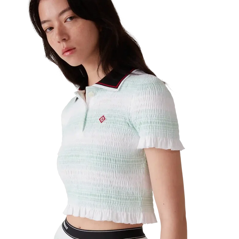 Das gestreifte, geraffte Poloshirt ist ein kurz geschnittenes Modell mit dem charakteristischen Rautenlogo des Hauses. Es ist aus gerafftem Baumwollstoff gefertigt und verfügt über einen gerippten Kragen mit gestreiften Kanten, eine Knopfleiste mit drei Knöpfen, kurze Ärmel sowie Rüschen an den Ärmelbündchen und am Saum. Es ist so geschnitten, dass es oberhalb des Bauchnabels sitzt.