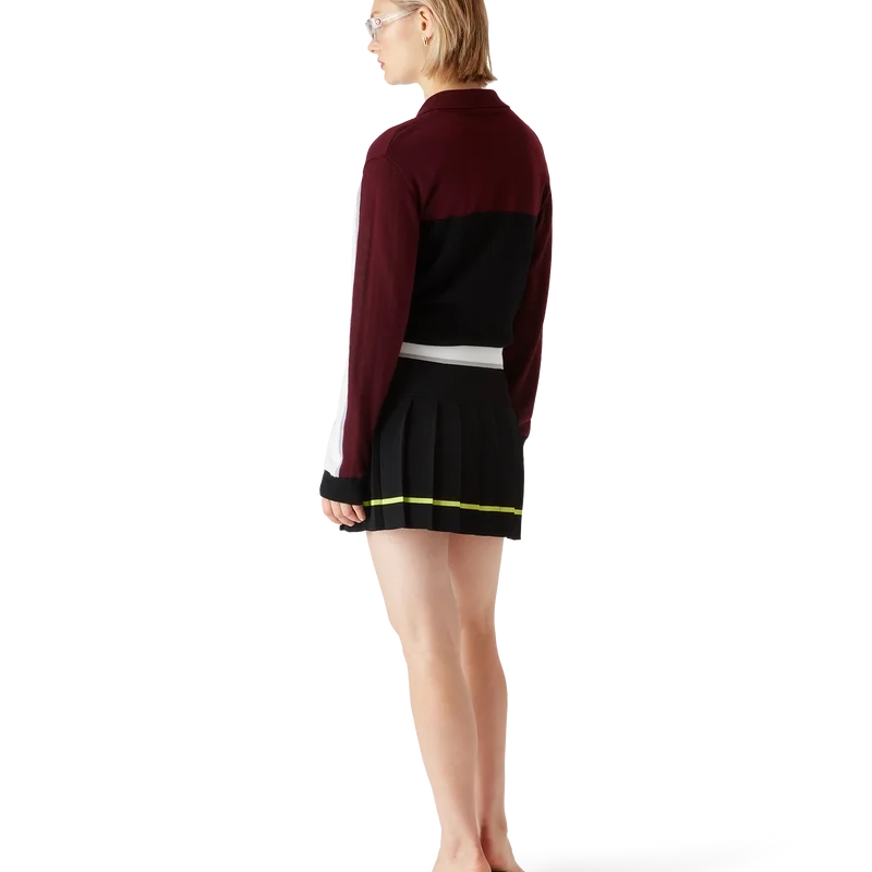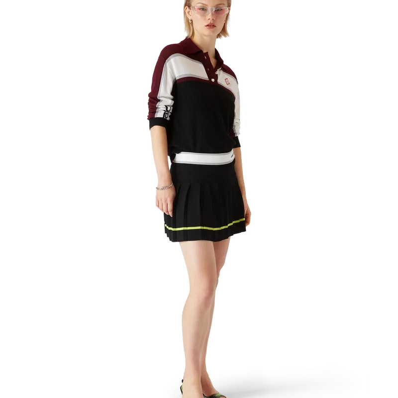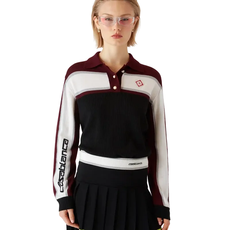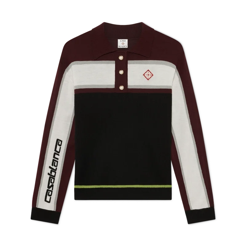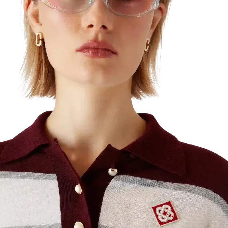 Das gestreifte, oversized Langarm-Poloshirt ist ein lässiges Apras-Sport-Design mit dem Diamant-Logo des Hauses. Abgerundet wird es durch das Casablanca-Logo an einem Ärmel, einen gerippten Einsatz am Körper, eine Knopfleiste mit charakteristischen, goldgerahmten Perlenknöpfen sowie gerippte Details an Kragen, Ärmelbündchen und Saum.