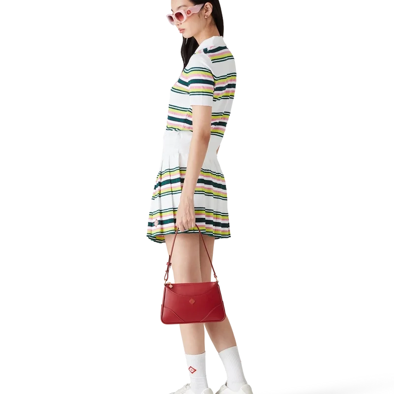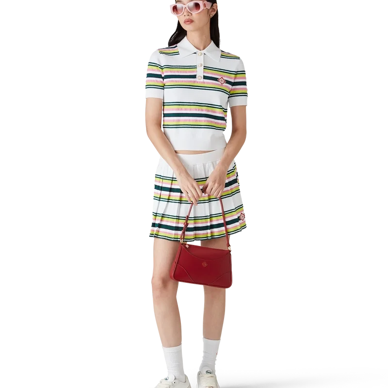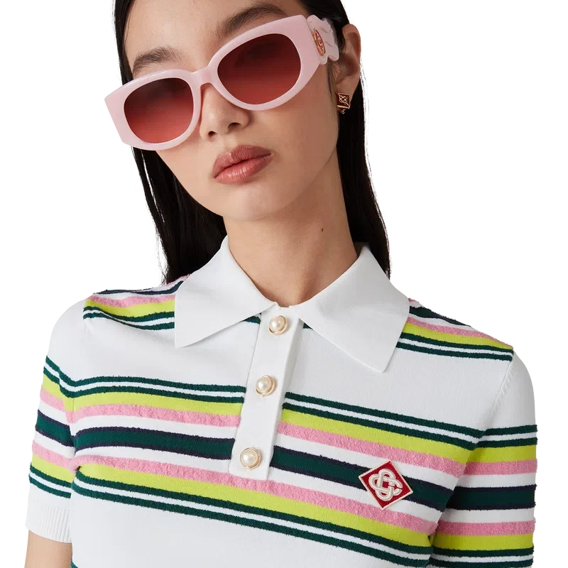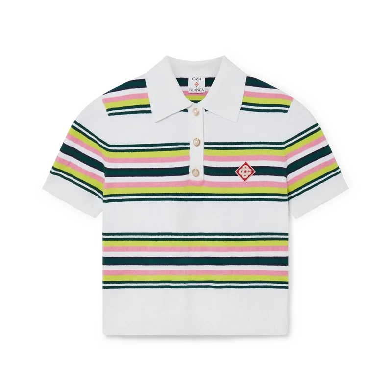 Das gestreifte Poloshirt ist ein kurzärmeliges Modell aus gestreiftem Strickstoff mit dem charakteristischen Rautenlogo des Hauses. Abgerundet wird es durch die charakteristischen goldgeränderten Perlknöpfe, eine Knopfleiste mit drei Knöpfen sowie gerippte Bündchen, Saum, Kragen und Knopfleiste.