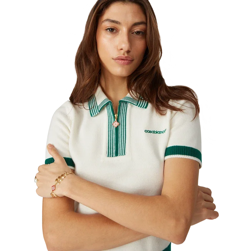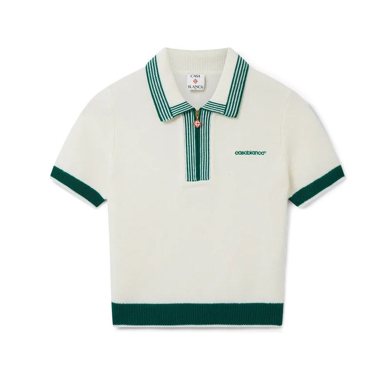 Das gestrickte Tennis-Poloshirt ist ein klassisches Design aus Merinowolle. Mit kontrastierenden Rippbündchen an Ärmeln, Saum, Kragen und Knopfleiste, Reißverschluss vorne, Rippkragen und Casablanca-Logo.