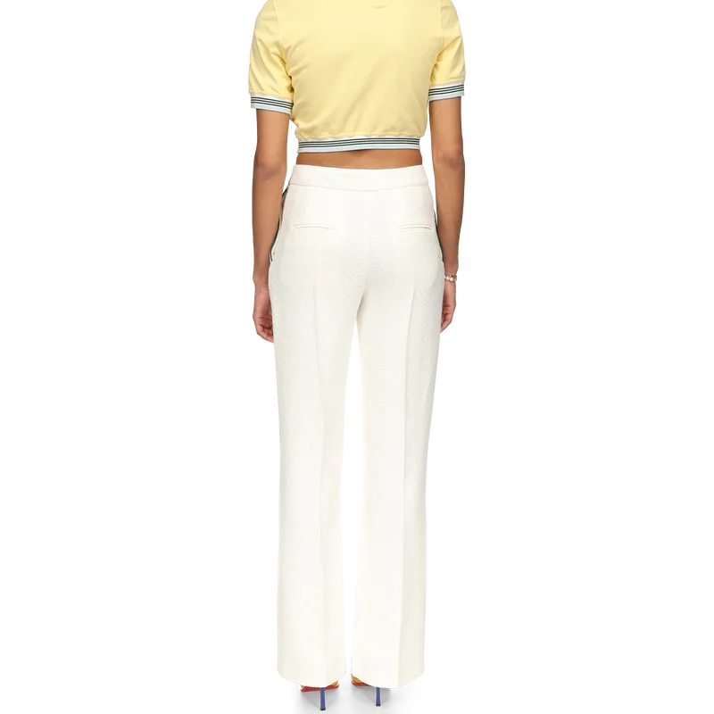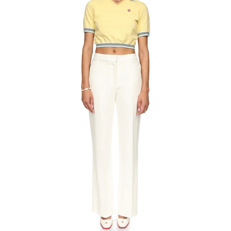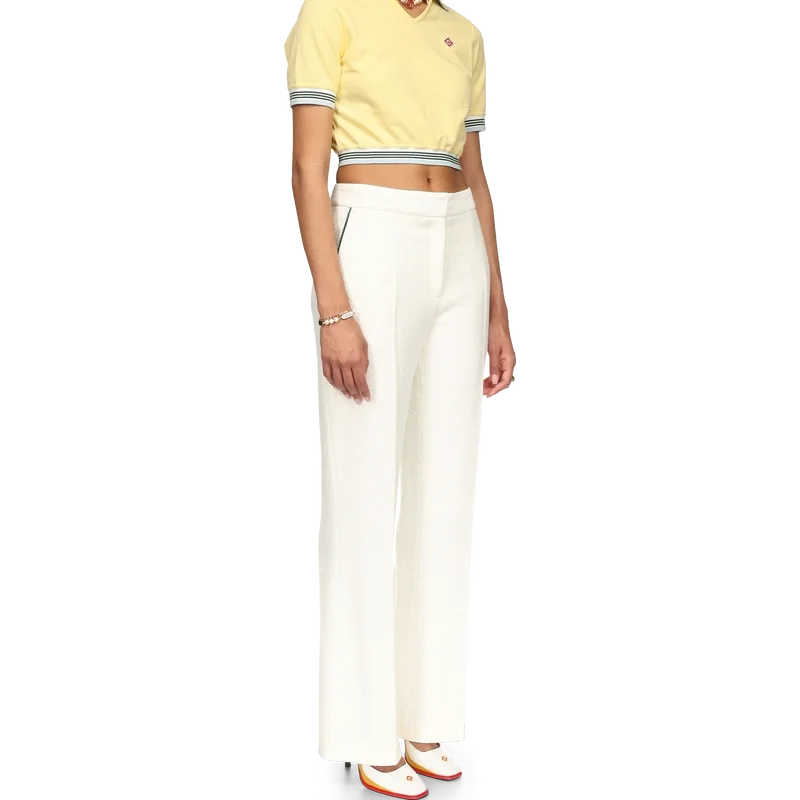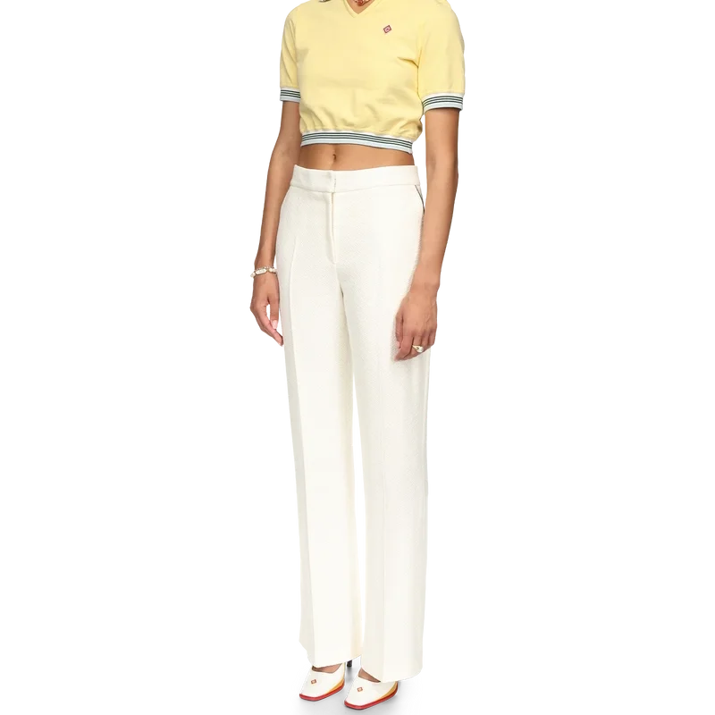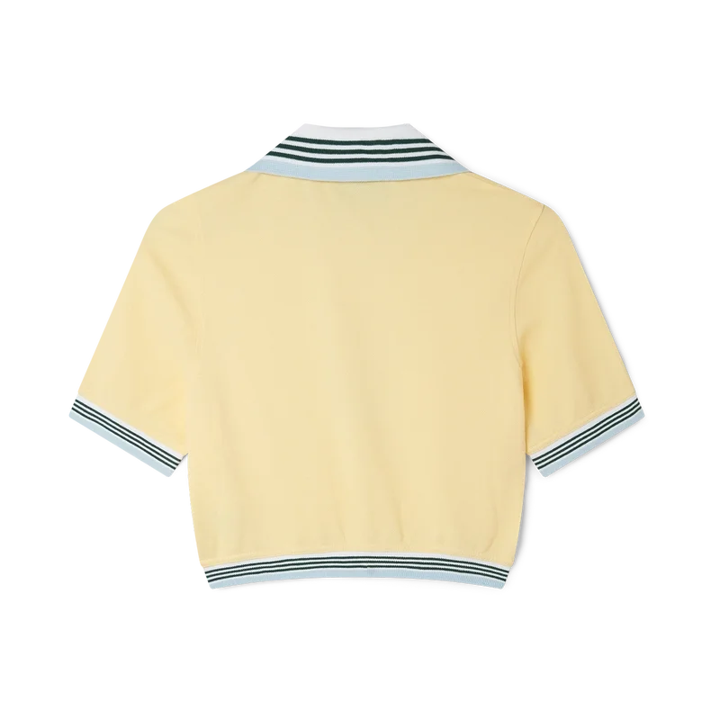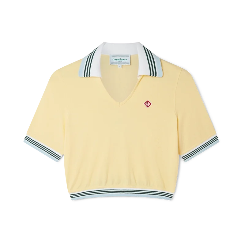 Das verkürzte Piqué-Poloshirt ist ein kurzärmeliges Modell mit V-Ausschnitt und leicht gerafftem Saum. Es besteht aus 100 % Baumwoll-Piqué und verfügt über einen gerippten Kragen und Ärmelbündchen mit Streifenmuster, ein Casablanca-Markenlabel sowie das Diamant-Logo des Hauses.