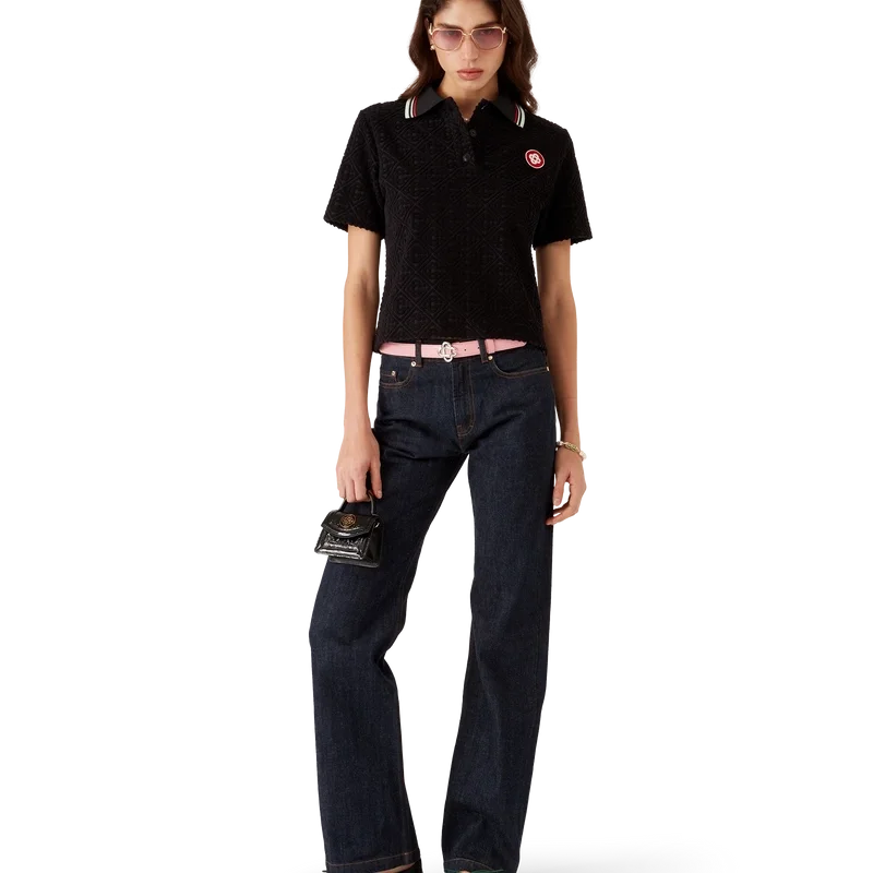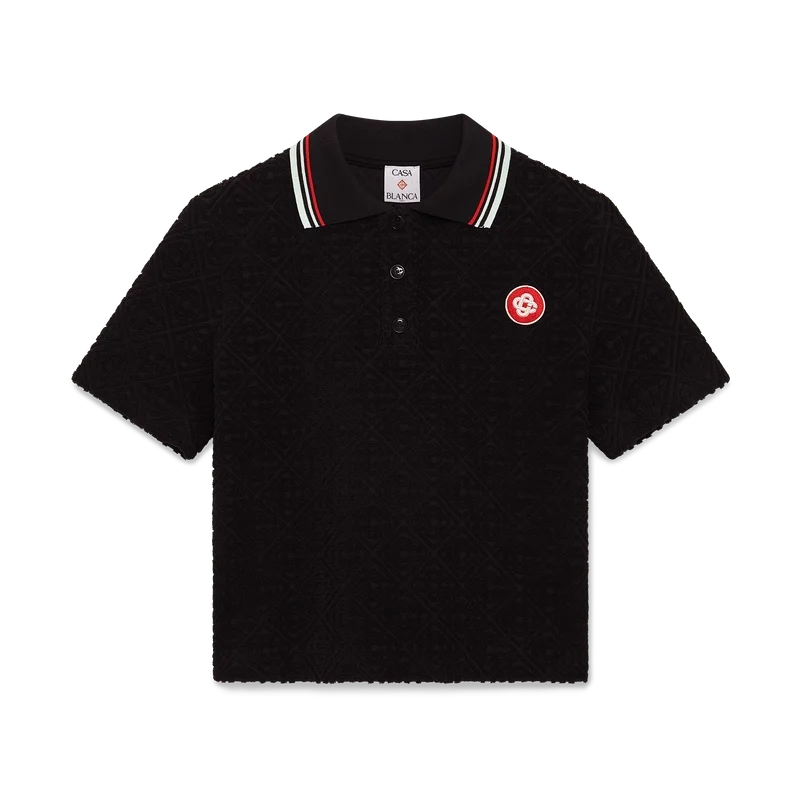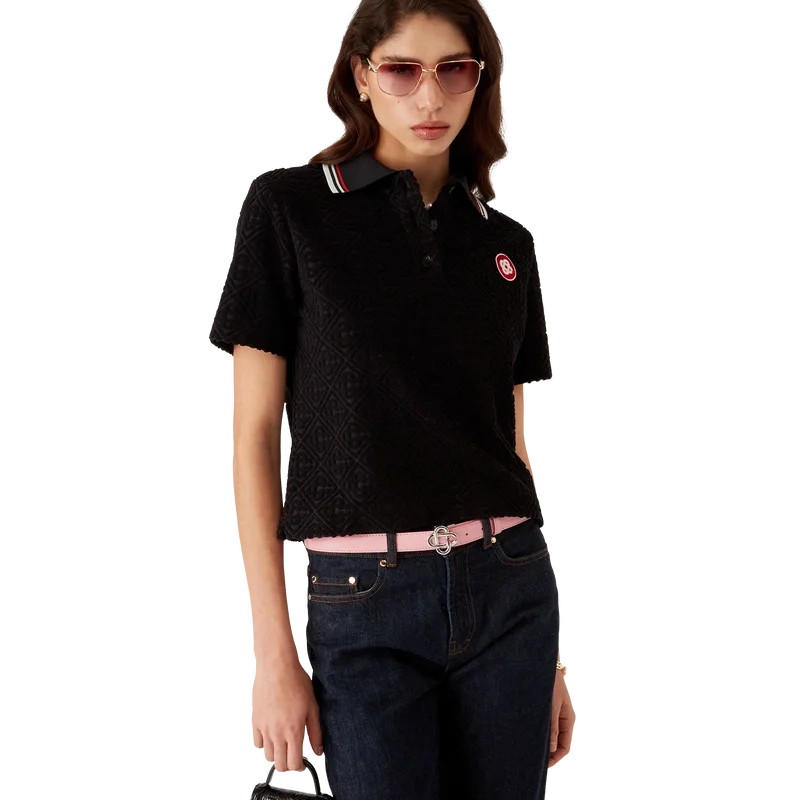 Das Monogram Jacquard-Frottee-Poloshirt ist ein kurzärmeliges Modell aus Monogram-Frottee. Mit Knopfleiste, Corozo-Knöpfen mit Cc-Logo, einem Cc-Logo-Aufnäher und einem gerippten Kragen mit gestreiften Kanten.