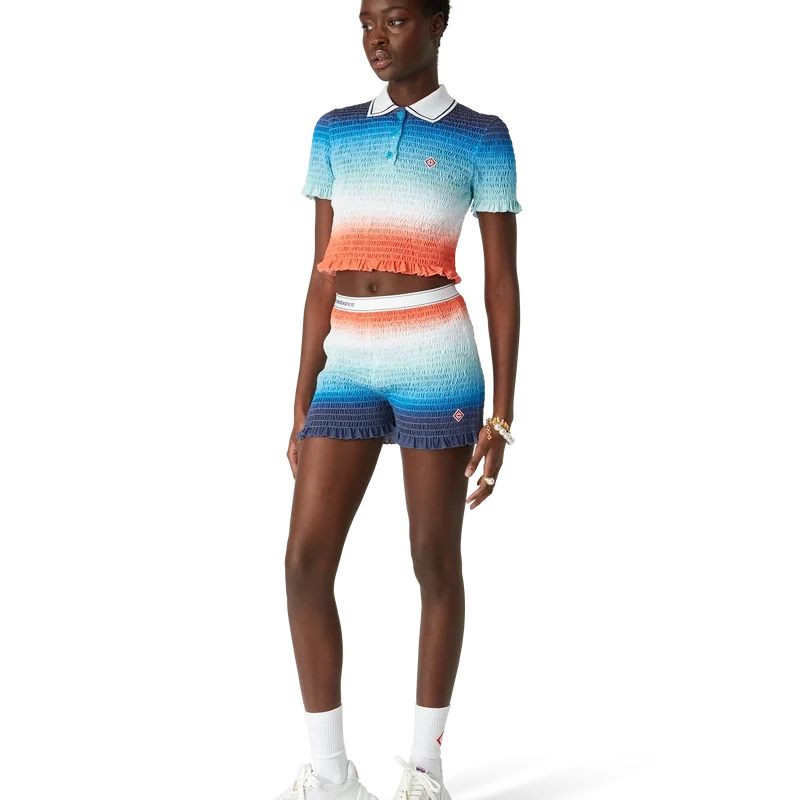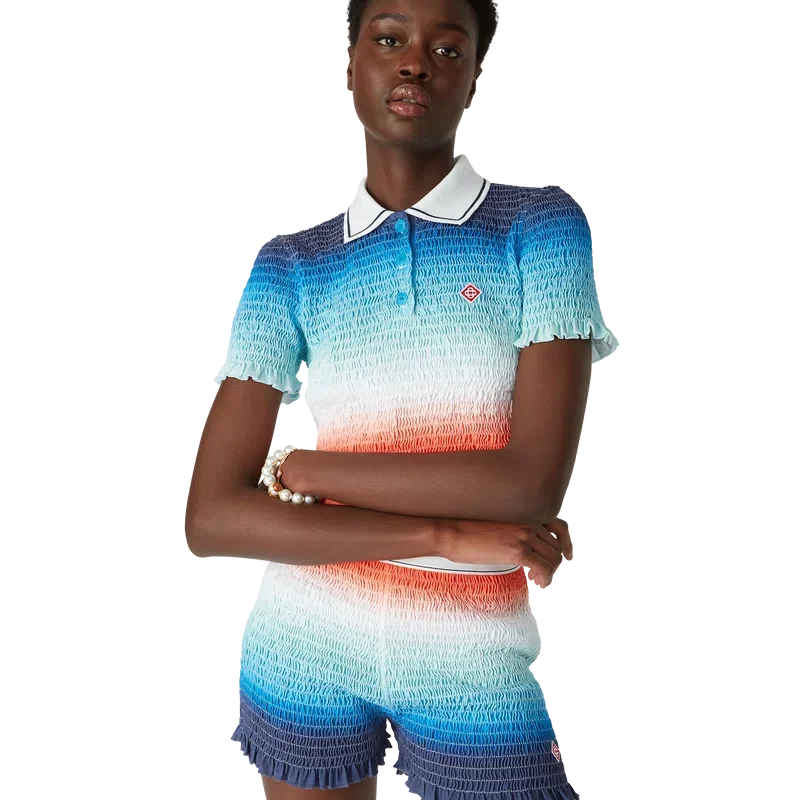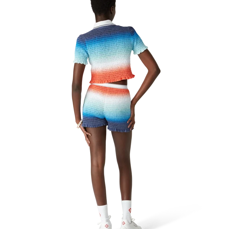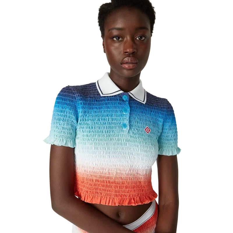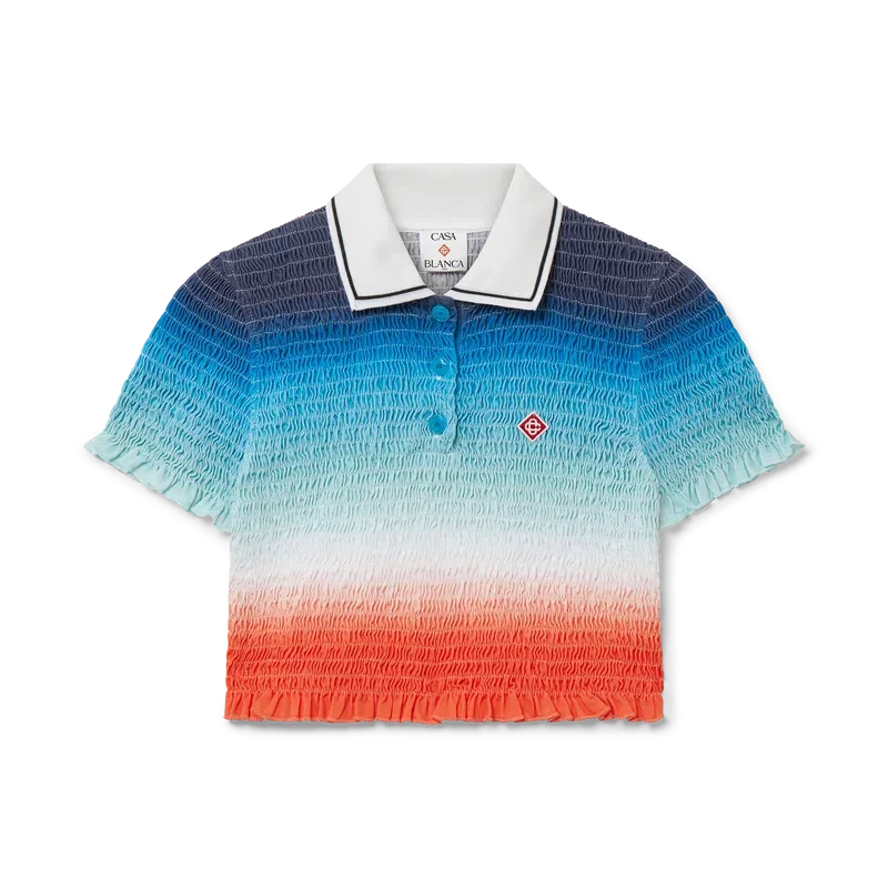 Das kurze Poloshirt mit Farbverlauf ist ein kurz geschnittenes Modell mit Allover-Print, das den saisonalen, lebendigen Farbverlauf des Hauses zeigt: von tiefem Tintenblau über Rosatöne bis hin zu leuchtendem Orange. Es symbolisiert den sich wandelnden Sommerhimmel, der am Horizont des Ozeans versinkt, und spielt auf die sich ständig verändernde Leinwand der Natur sowie das charakteristische Diamantlogo des Hauses an. Es ist aus gerafftem Baumwollstoff gefertigt und verfügt über einen kontrastierenden Kragen mit Kantenverzierung, eine Knopfleiste mit drei Knöpfen, kurze Ärmel sowie Rüschen an den Ärmelbündchen und am Saum. Das Modell ist so geschnitten, dass es oberhalb des Bauchnabels sitzt.
