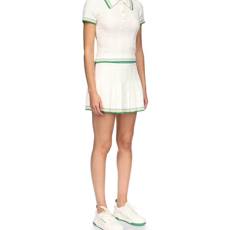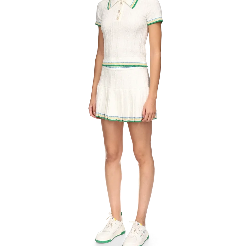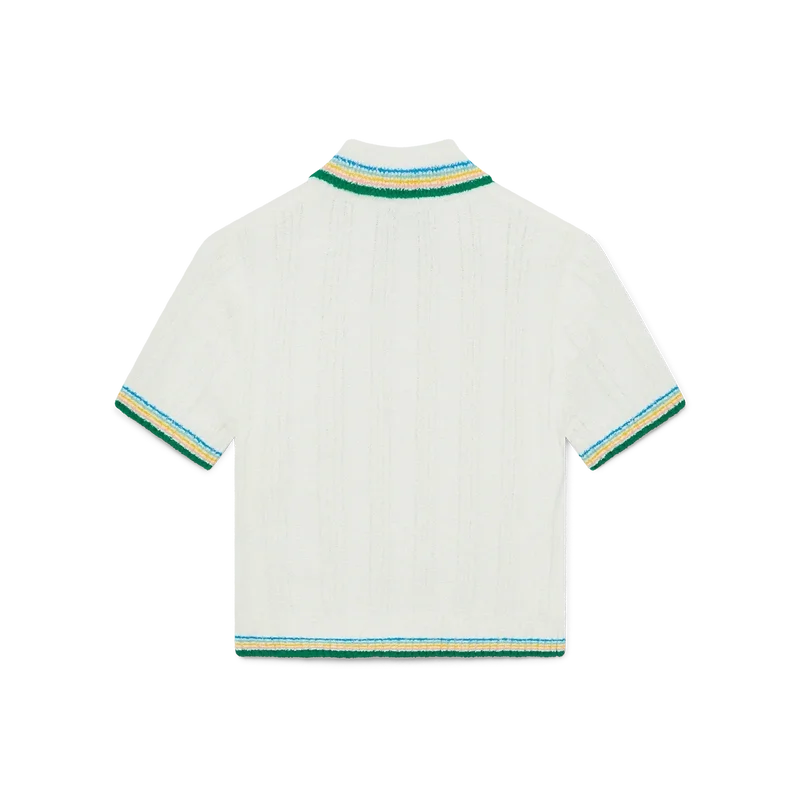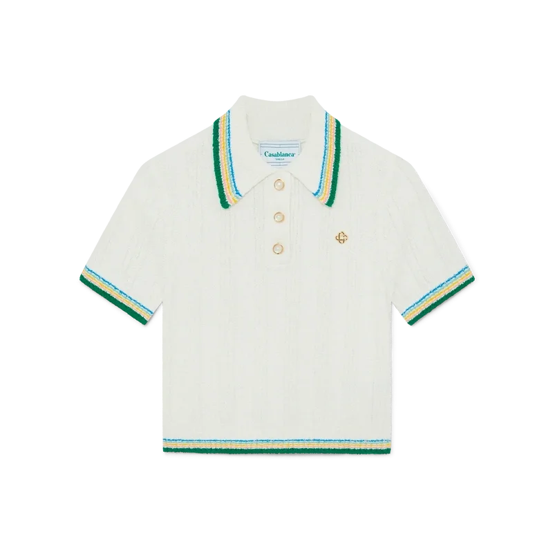 Das Rib-Bouclé-Poloshirt hat eine weiche Rippenstruktur und ist auf der Brust mit dem vergoldeten, ineinander verschlungenen CC-Logo-Nieten des Hauses verziert. Es ist aus einem Rippstrickstoff aus Baumwollmischung gefertigt und mit den charakteristischen goldumrandeten Perlknöpfen sowie Streifenverzierungen an Kragen, Manschetten und Saum versehen.
