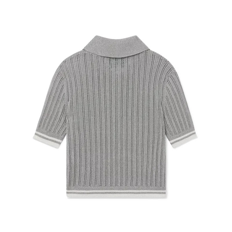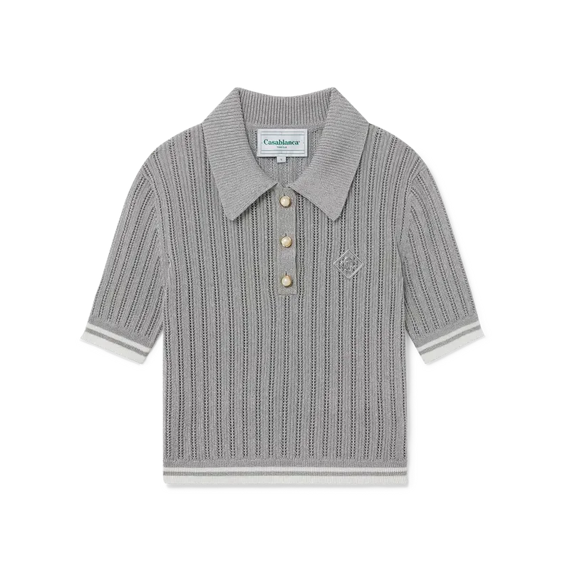 Das silberne Kurzarm-Poloshirt ist ein kurzes Modell aus einem gestrickten, metallischen Polyester-Mischgewebe mit dem Diamant-Logo des Hauses in transparentem Polyurethan-Design. Abgerundet wird es durch die charakteristischen, goldumrandeten Perlenknöpfe des Hauses, Streifendetails an den Ärmelbündchen und am Saum sowie einen gerippten Kragen, Ärmelbündchen, Saum und Knopfleiste.