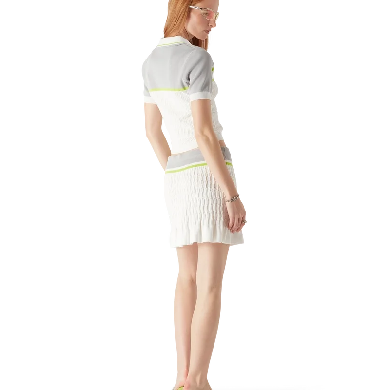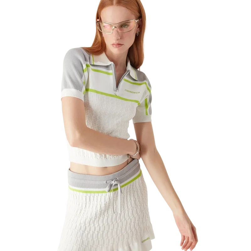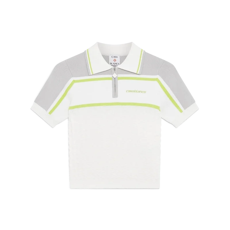 Das Tennis-Poloshirt ist ein Strickmodell mit kontrastierenden Schultern und Ärmelaufsätzen. Abgerundet durch einen Reißverschluss, einen Kragen mit gestreiften Kanten, das charakteristische Casablanca-Logo sowie gerippte Manschetten und Saumdetails.
