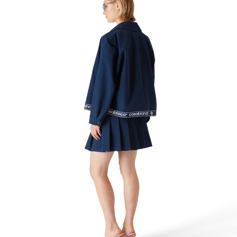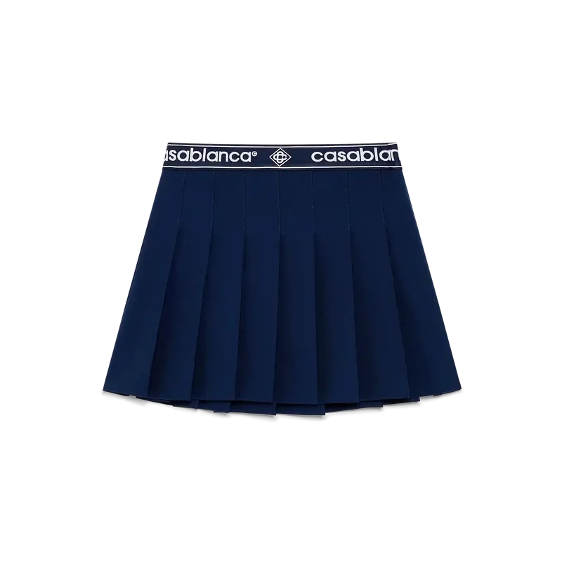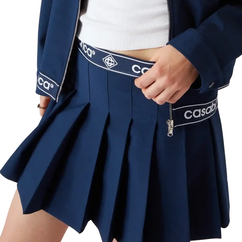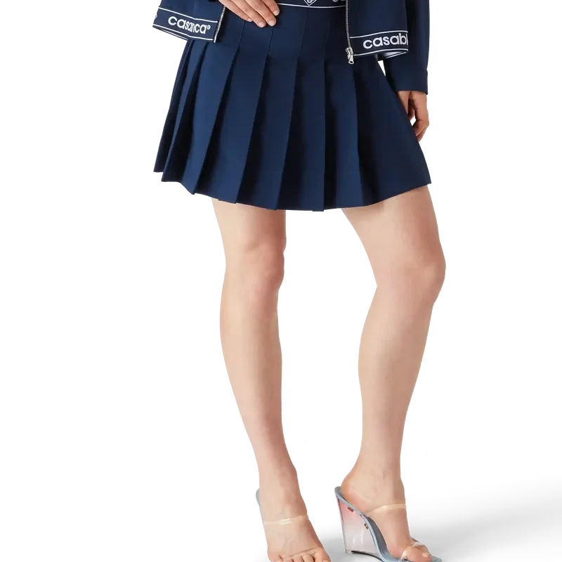 Der Faltenrock ist ein kurz geschnittenes Modell aus einem Wollmischgewebe, das mit dem charakteristischen Casablanca-Logo und dem Diamant-Logo des Hauses verziert ist. Abgerundet wird er durch einen Bund mit Markenband und durchgehende, raffinierte Falten.